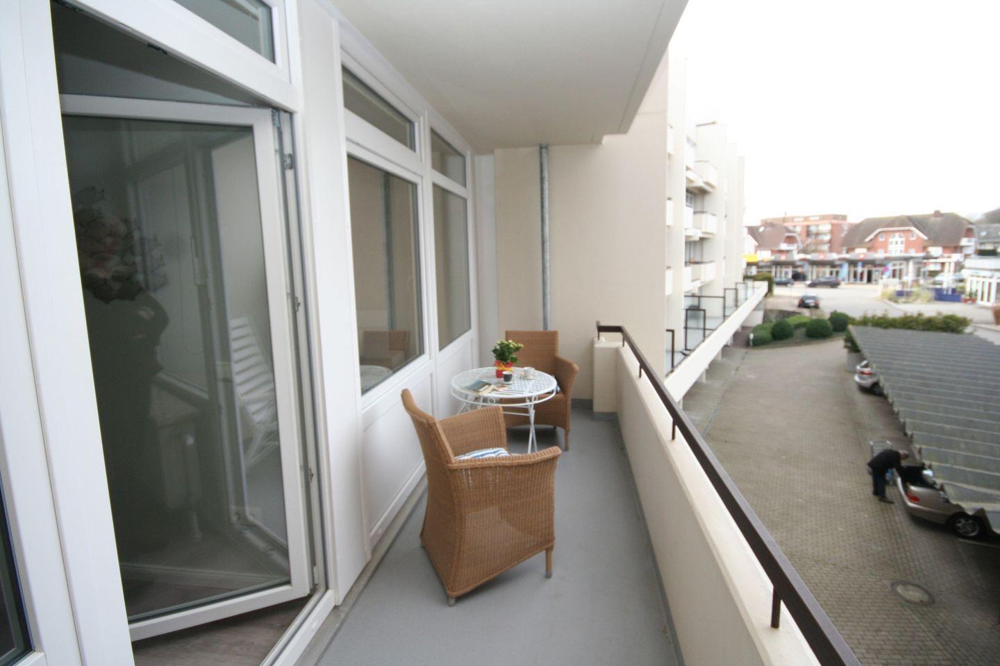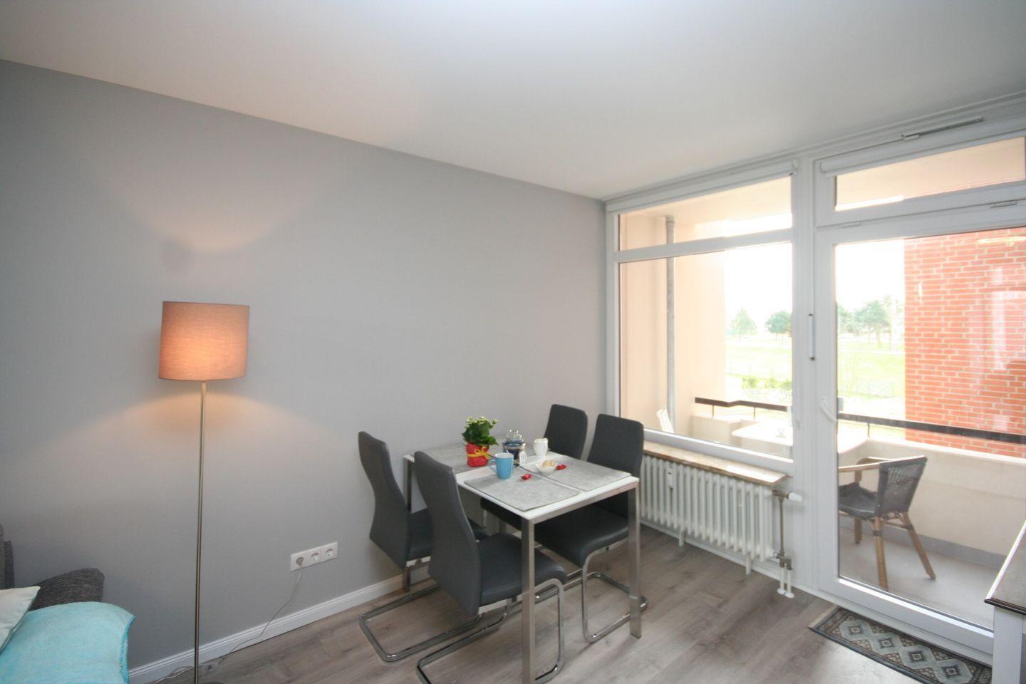 Der Essbereich findet vor dem Balkonelement seinen Platz. Genießen Sie den Luxus zweier Balkone, wodurch das Wohnzimmer lichtdurchflutet ist: Sonne morgens zum Frühstück – mit Teilmeerblick- und ab nachmittags auf dem großen Balkon zum Sonnenuntergang.