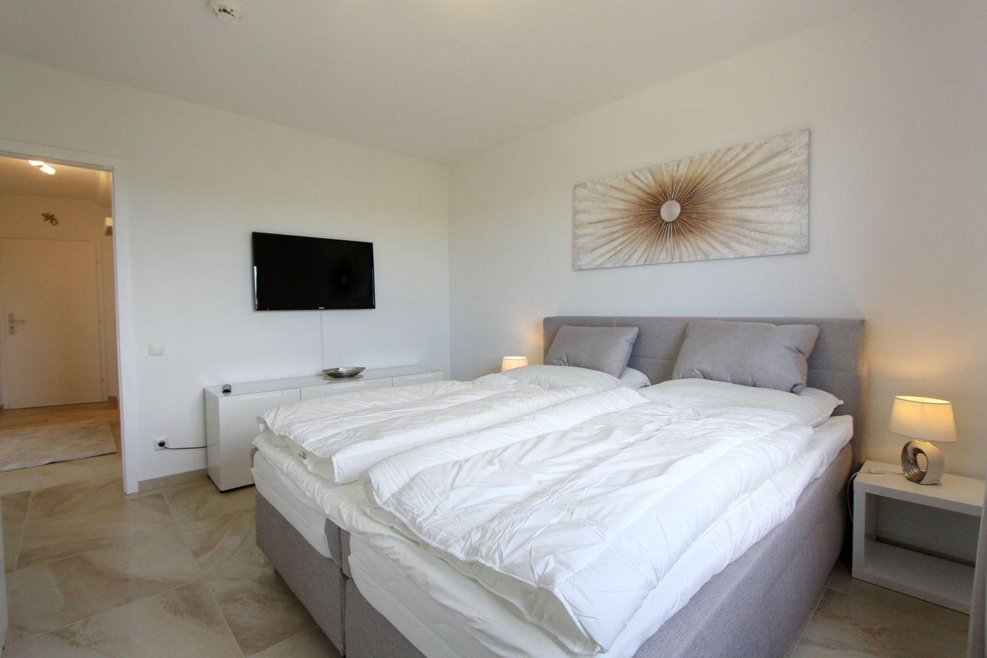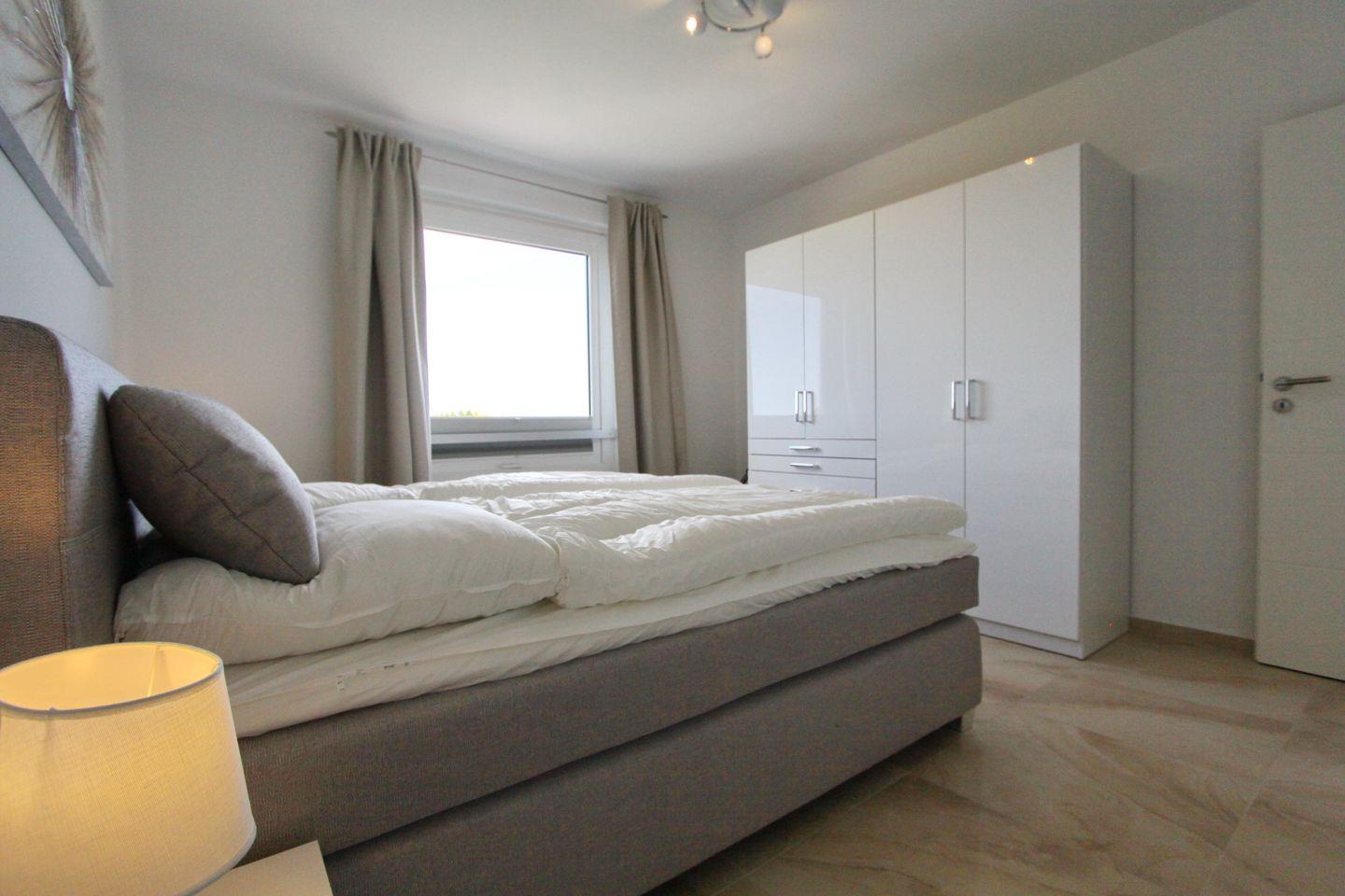 Das Schlafzimmer verfügt über ein Doppelbett (2x90x200 cm), Kleiderschrank und Flach TV.