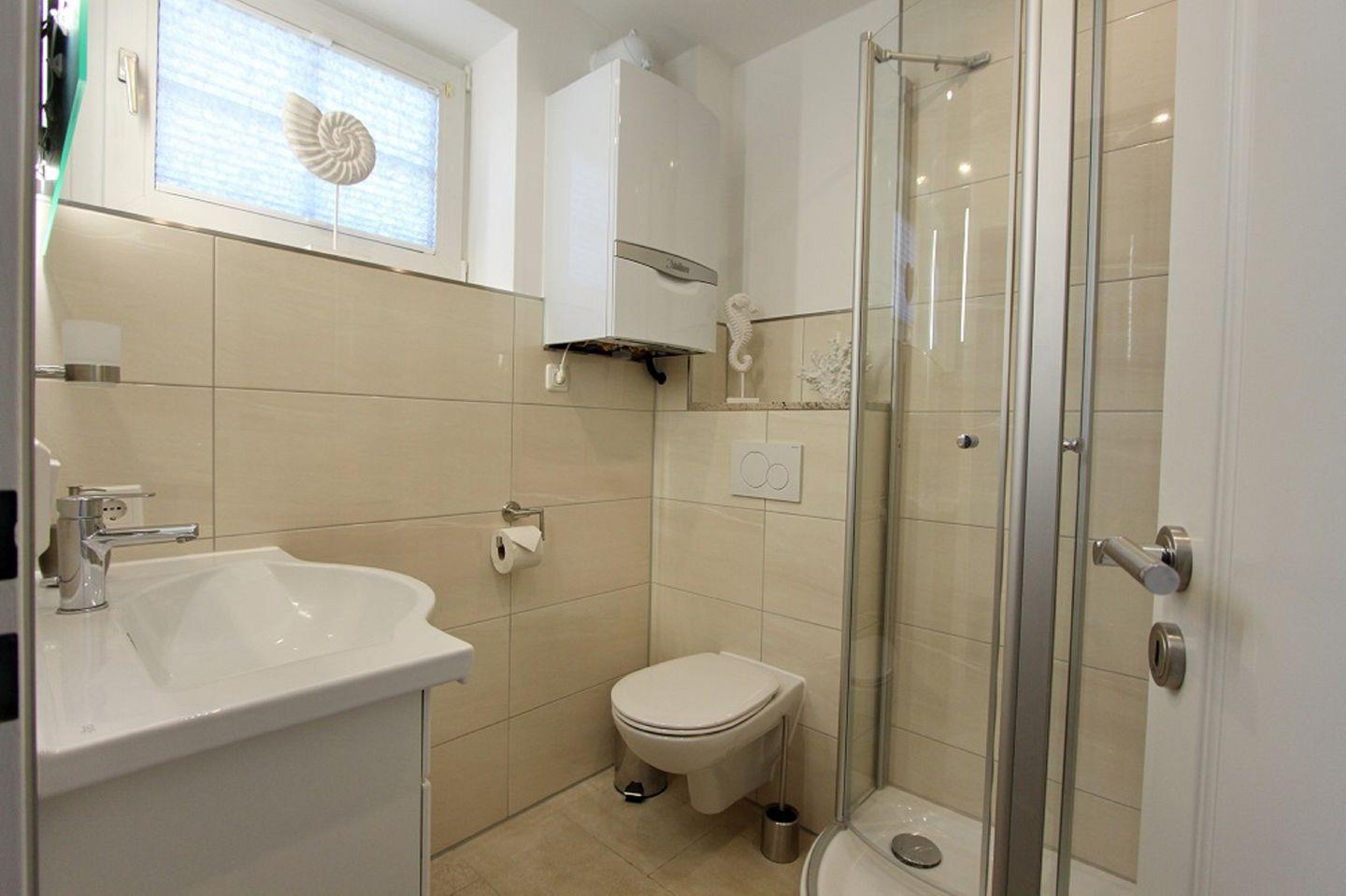 Zu Ihrer linken finden Sie das Duschbad mit Waschtisch, Spiegelschrank und Fenster.