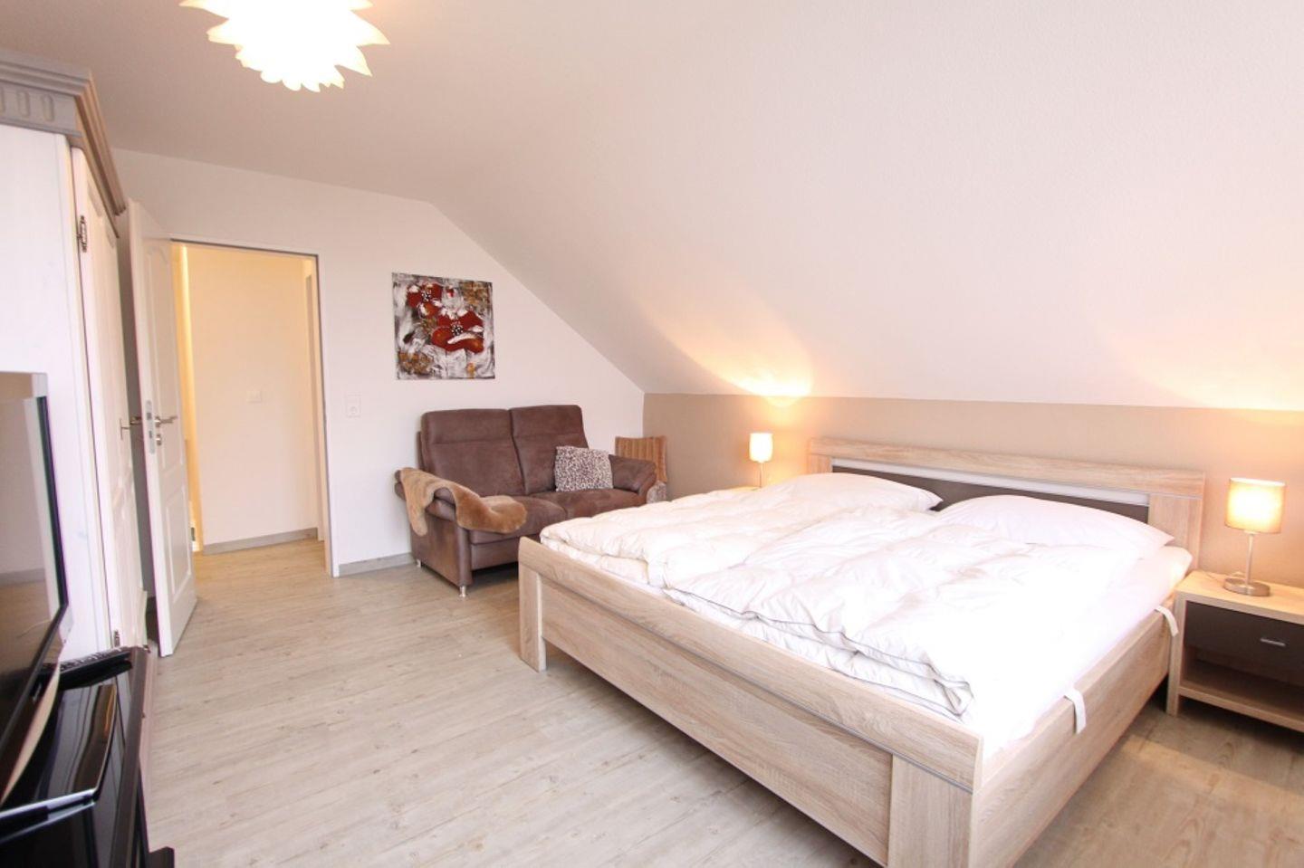 In dem ersten Schlafzimmer erwartet Sie ein Doppelbett (2x90x200cm), ein Kleiderschrank, ein Flach TV und Sitzgelegenheiten.