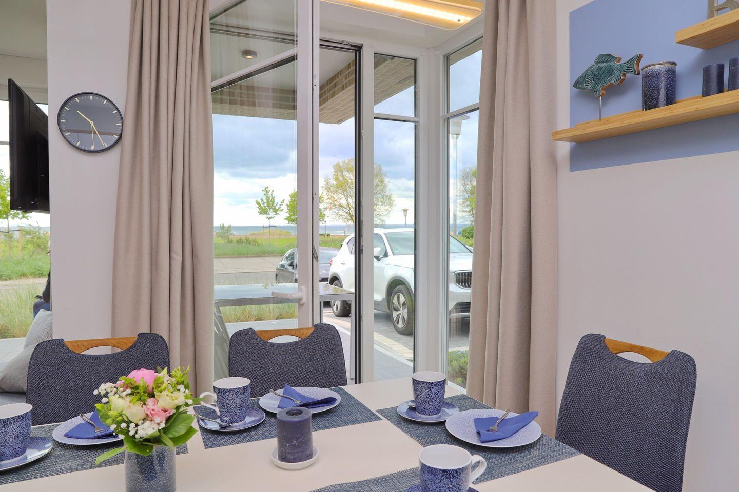 Die moderne, sehr gut ausgestattete Küche lockt zum gemeinsamen Kochen mit den Liebsten. Der sich unmittelbar angrenzende Essplatz ist für bis zu 6 Personen ausgerichtet. Auch ein Kinderhochstuhl fehlt nicht. Somit können auch die Kleinsten ihr Essen mit Blick auf das Meer im Kreise der Familie und Freunde genießen.