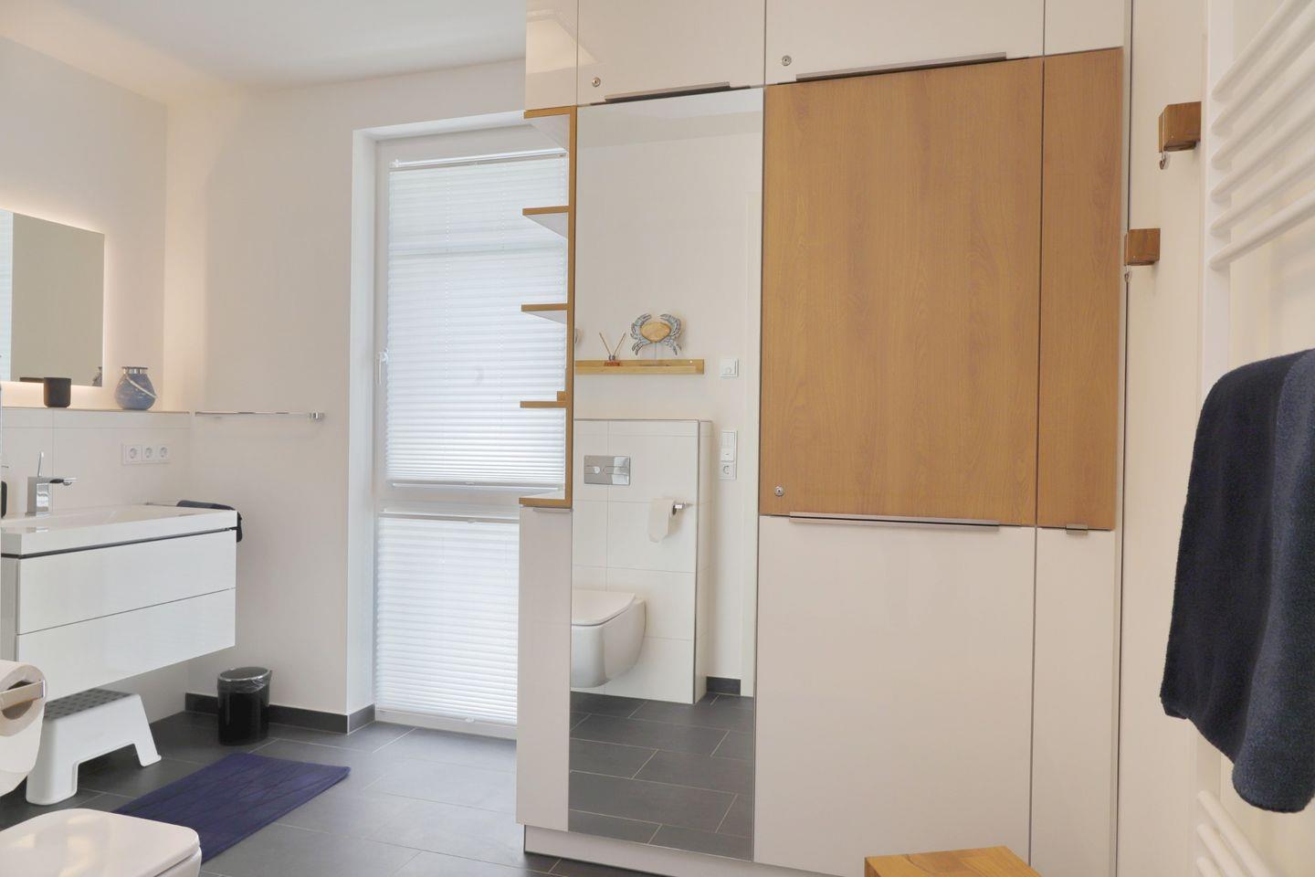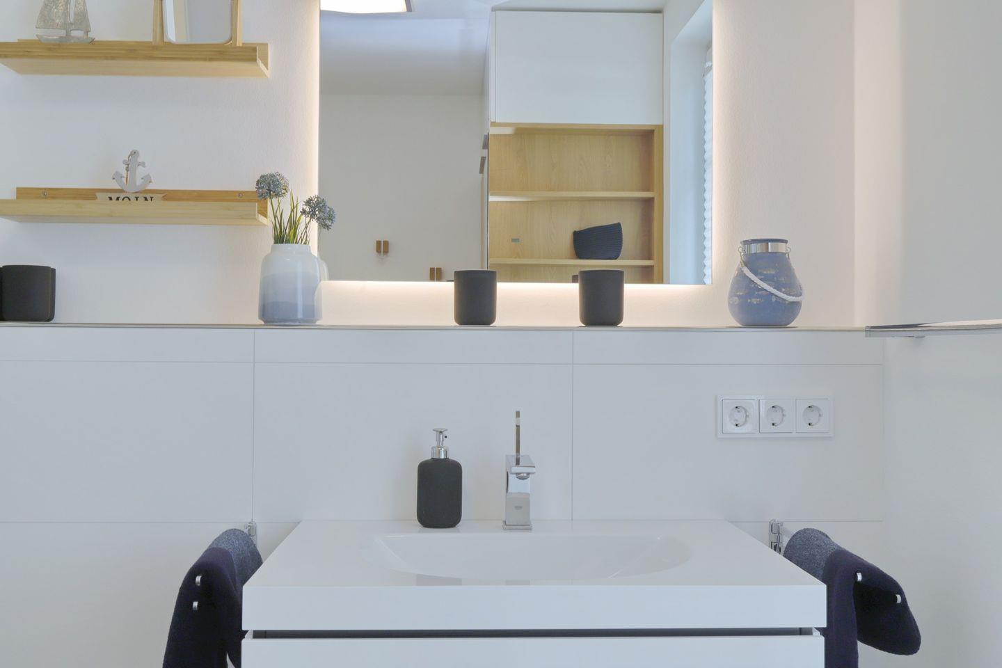 Das Bad überzeugt mit seiner bodengleichen Dusche, in der auch ein Regenduschkopf nicht fehlt. WC, Handtuchheizung, ein moderner Waschtisch und Föhn gehören ebenfalls zur Ausstattung.
