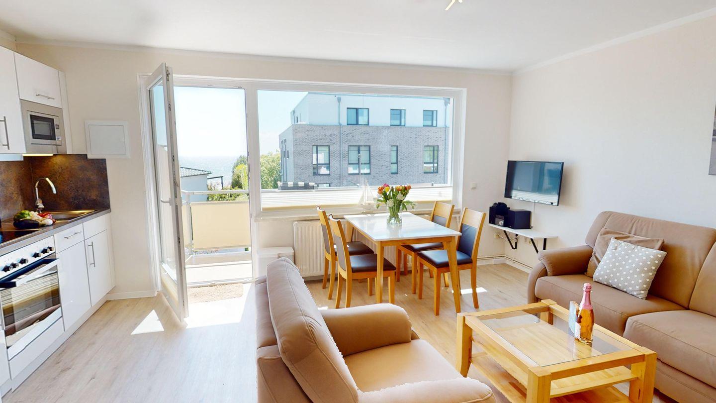 Die Wohnung verfügt über ein Schlafzimmer, eine komplett ausgestattete Einbauküche, ein neuwertiges Badezimmer mit Dusche sowie einen Wohnbereich mit einem Sofa (mit Schlaffunktion für eine Person). Abgerundet wird die Wohnung durch den möblierten Balkon mit Meerblick.