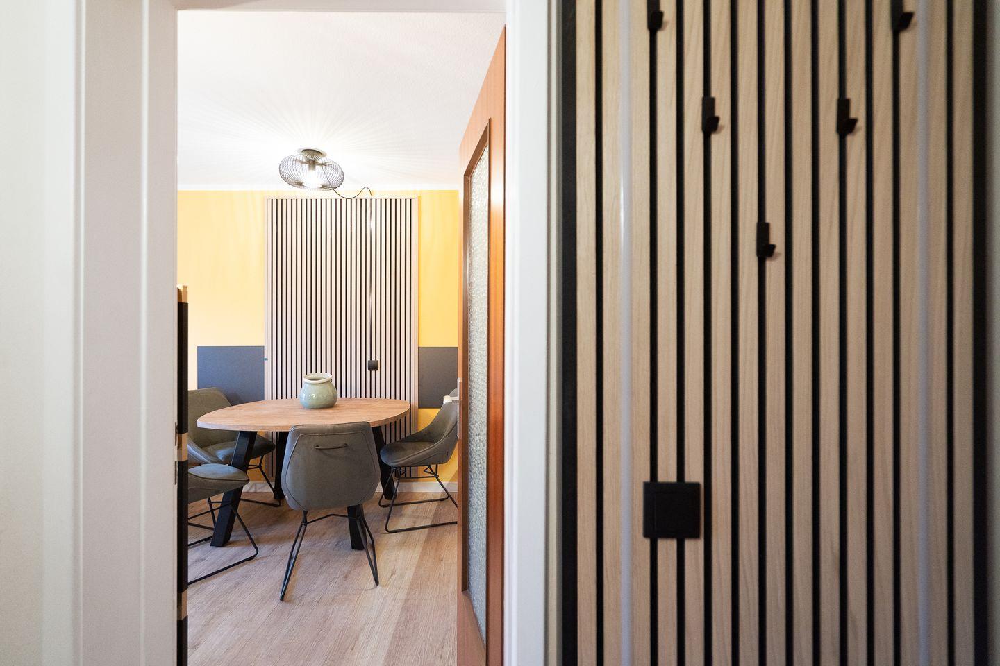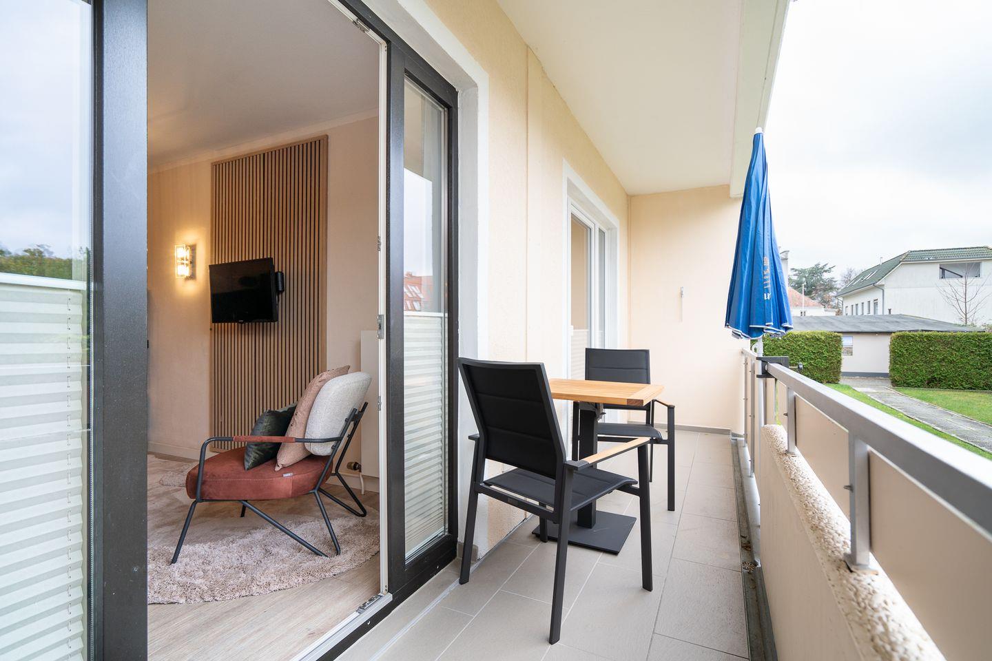 Die Küche ist gut ausgestattet und geht in eine kleine Essecke über, die zum Verweilen und gemeinsamen Kochen einlädt. Der große Balkon mit gemütlichen Möbeln bietet zudem den perfekten Ort zum Entspannen und Genießen der frischen Luft.