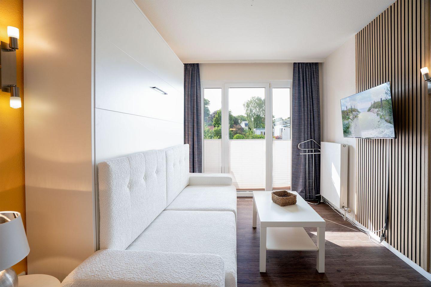 Nur wenige Gehminuten vom Strand entfernt befindet sich diese schöne 18 m² Ferienwohnung im 1. Stock, die Platz für 1-2 Personen bietet – auch Ihr Hund ist willkommen. Die Wohnung verfügt über einen hellen Wohnbereich mit einem Sofa-Schrankbett für 2 Personen. Das Badezimmer ist mit einer Dusche ausgestattet. Die Wohnung wird durch eine kleine Küchenzeile mit einem Essplatz sowie einen möblierten Balkon abgerundet.