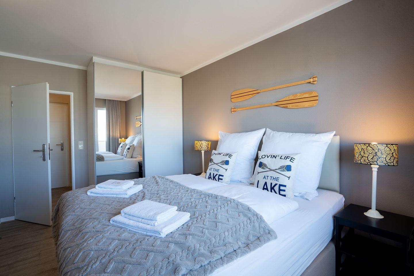 Die Wohnung verfügt über ein gemütliches Schlafzimmer mit Doppelbett und Verdunklungsmöglichkeiten für erholsame Nächte. Auf Wunsch stellen wir Ihnen ein Kinderbett und einen Hochstuhl zur Verfügung. Das Badezimmer ist mit einer modernen Dusche ausgestattet.