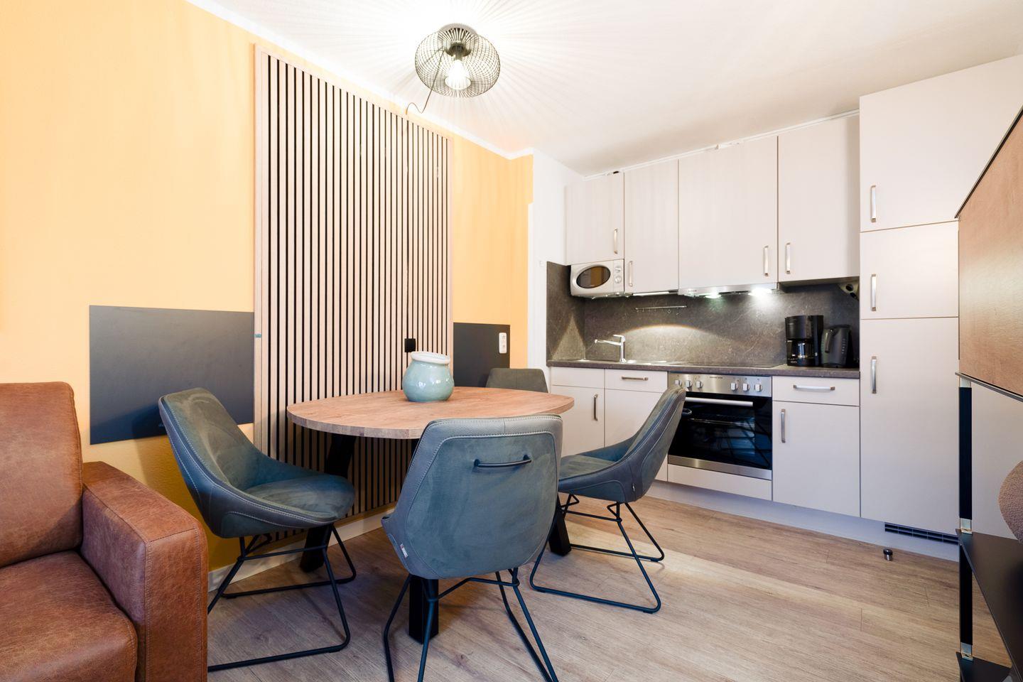 Eine moderne Küchenzeile mit angrenzender Essecke bietet Ihnen die Möglichkeit, Ihre Mahlzeiten ganz nach Wunsch zuzubereiten. Der große Balkon mit bequemen Balkonmöbeln lädt dazu ein, die frische Meeresluft zu genießen.