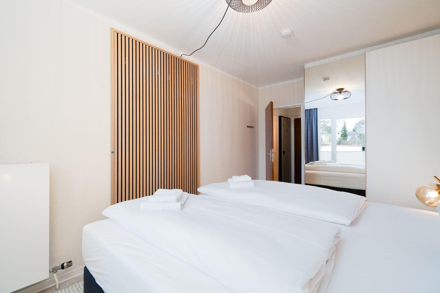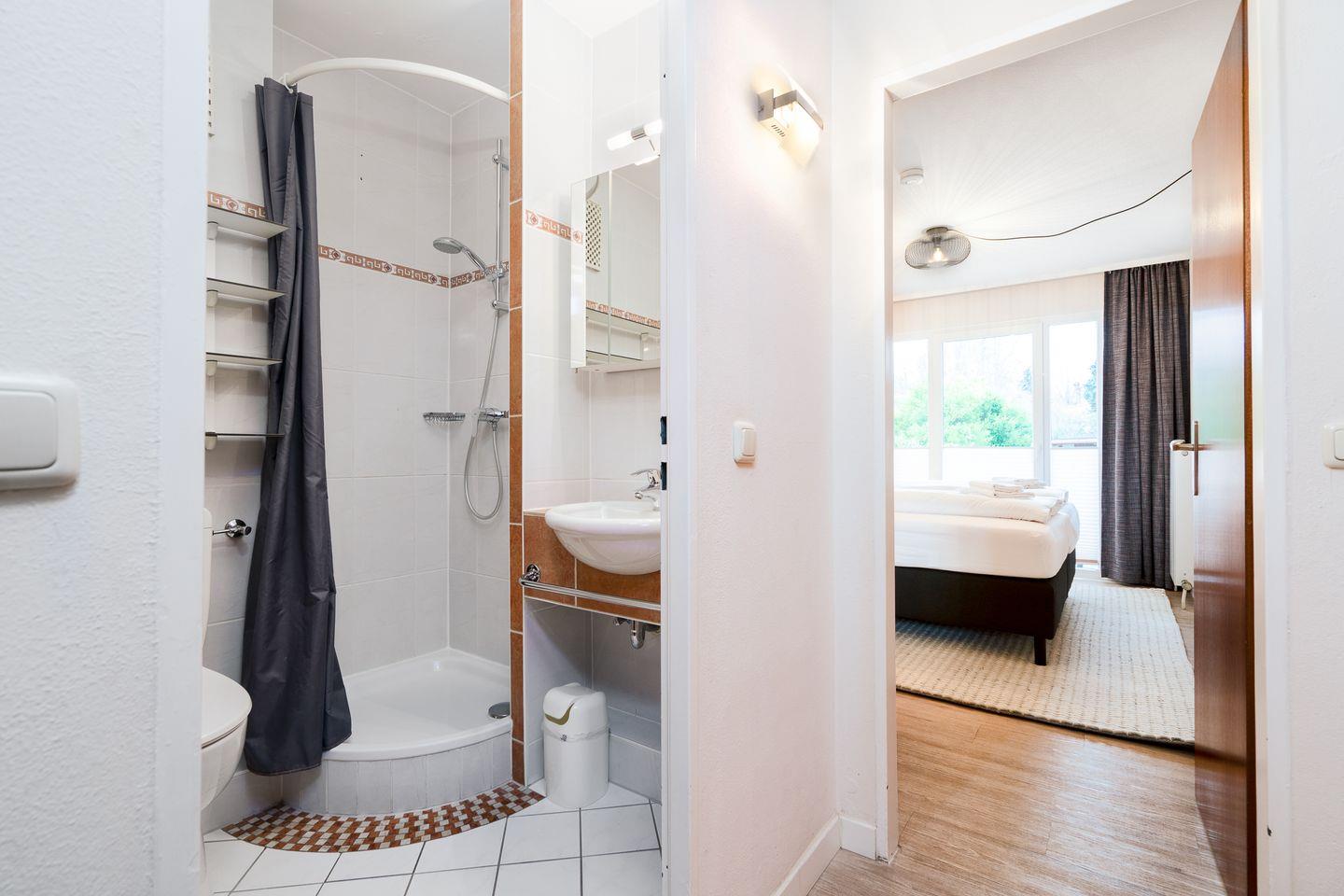 Das gemütliche Schlafzimmer ist mit einem Doppelbett ausgestattet, während eine komfortable Schlafcouch im Wohnbereich zwei weitere Schlafplätze bietet. Beide Räume lassen sich vollständig abdunkeln, um Ihnen erholsame Nächte zu ermöglichen. Auf Wunsch stellen wir Ihnen kostenfrei ein Kinderbett und einen Hochstuhl zur Verfügung. Das Badezimmer verfügt über eine moderne Dusche.
