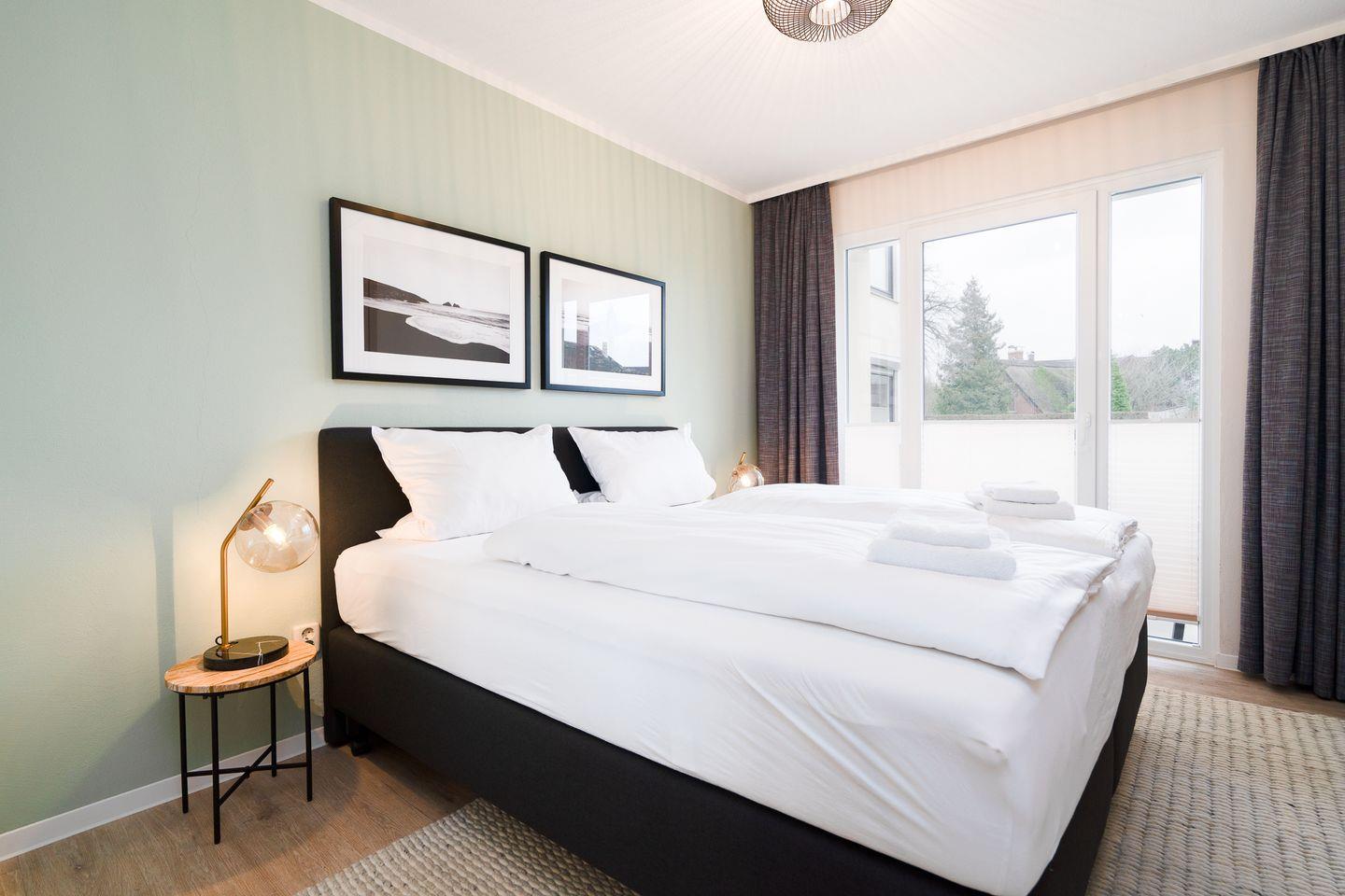 Die Wohnung verfügt über ein Schlafzimmer mit Doppelbett und bietet eine zusätzliche Schlafgelegenheit im Wohnbereich für 2 Personen auf einer komfortablen Schlafcouch. Beide Räume lassen sich abdunkeln. Auf Wunsch stellen wir gerne ein Kinderbett und einen Hochstuhl zur Verfügung. Das Bad ist mit einer Dusche ausgestattet.