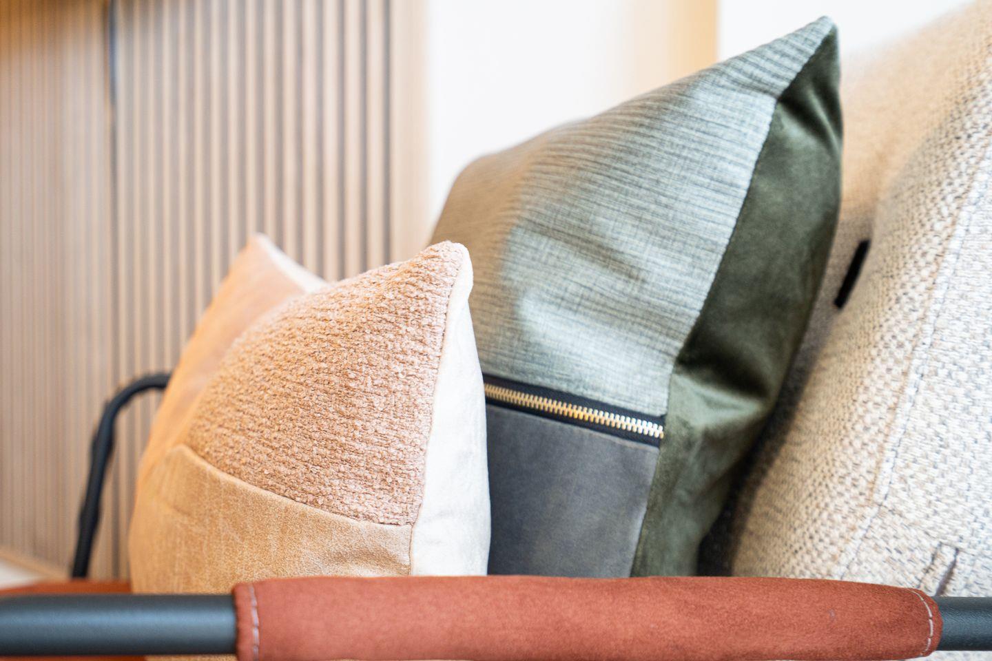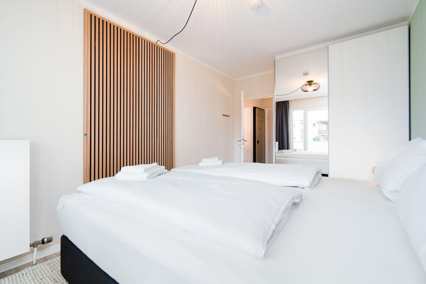 Die Wohnung verfügt über ein komfortables Schlafzimmer mit Doppelbett und eine hochwertige Schlafcouch im Wohnbereich, die Platz für zwei weitere Personen bietet. Beide Räume sind mit Verdunklungsmöglichkeiten ausgestattet, um Ihnen erholsame Nächte zu garantieren. Auf Wunsch stellen wir Ihnen kostenfrei ein Kinderbett und einen Hochstuhl zur Verfügung. Das moderne Badezimmer ist mit einer praktischen Dusche ausgestattet.