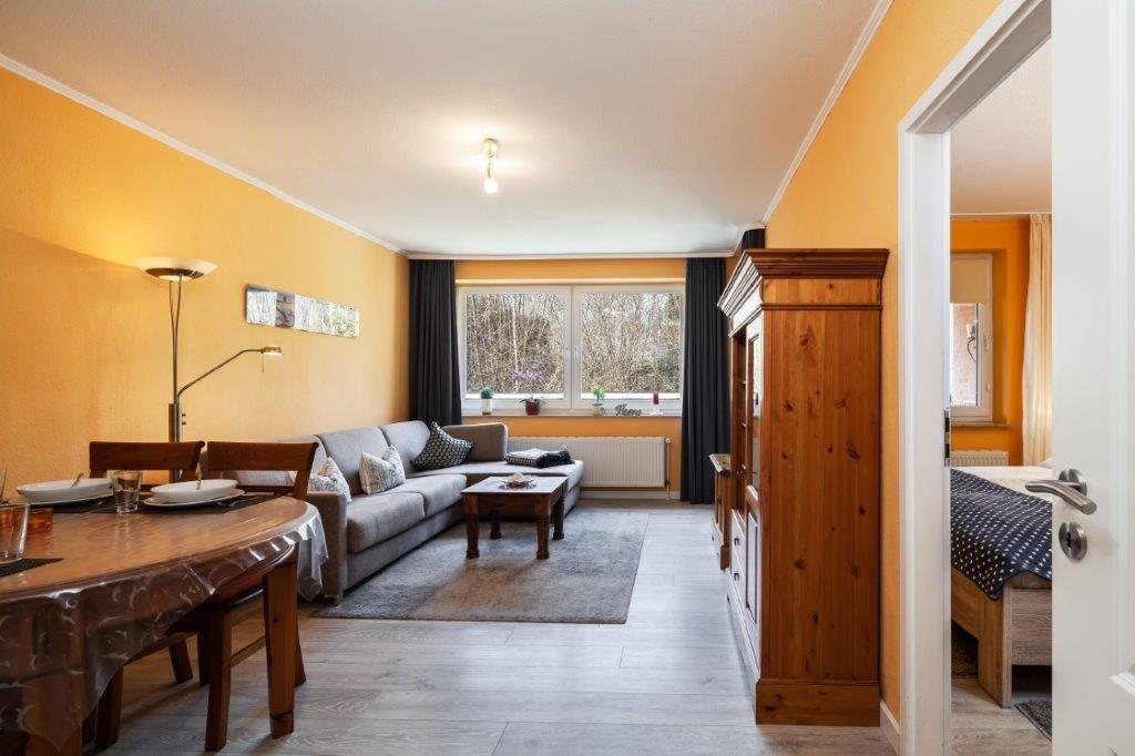 Das großzügige Wohn-/ Esszimmer ist mit einem gemütlichen Ecksofa ausgestattet welches bei einer Belegung mit 4 Personen in ein komfortables Bett (140x200) mit Ergoflex-Lattenrost und hochwertiger Matratze umwandelbar ist.