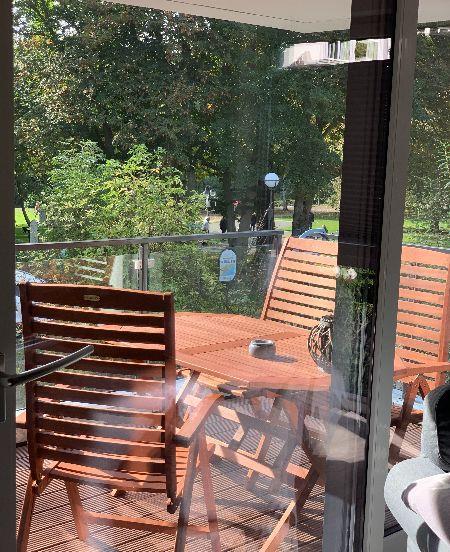 Stilvolle 70?m² Ferienwohnung mit zwei Schlafzimmern, modernem Bad und offenem Wohn-Essbereich. Voll ausgestattete Küche, gemütliche Sofaecke, möblierter Balkon mit traumhaftem Blick in den Kurpark – ideal zum Entspannen und Genießen