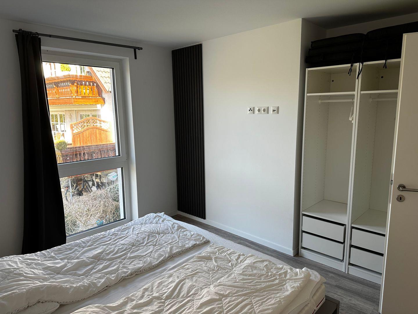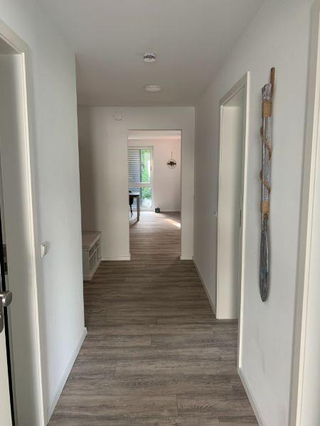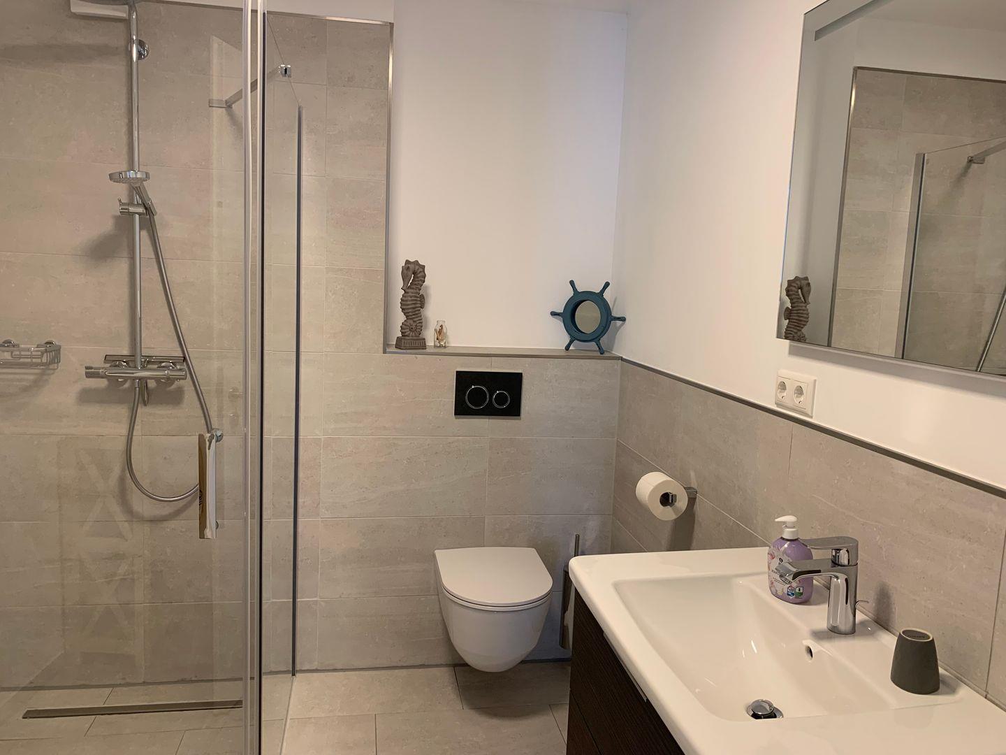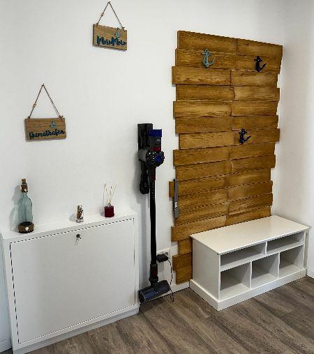 Das moderne Badezimmer ist mit einer begehbaren Dusche, einem WC und einem stilvollen Waschtisch ausgestattet – ideal für einen frischen Start in den Tag. Im Eingangsbereich finden Sie eine praktische Garderobe sowie einen Schuhschrank und einen Staubsauger, sodass auch längere Aufenthalte angenehm organisiert bleiben.