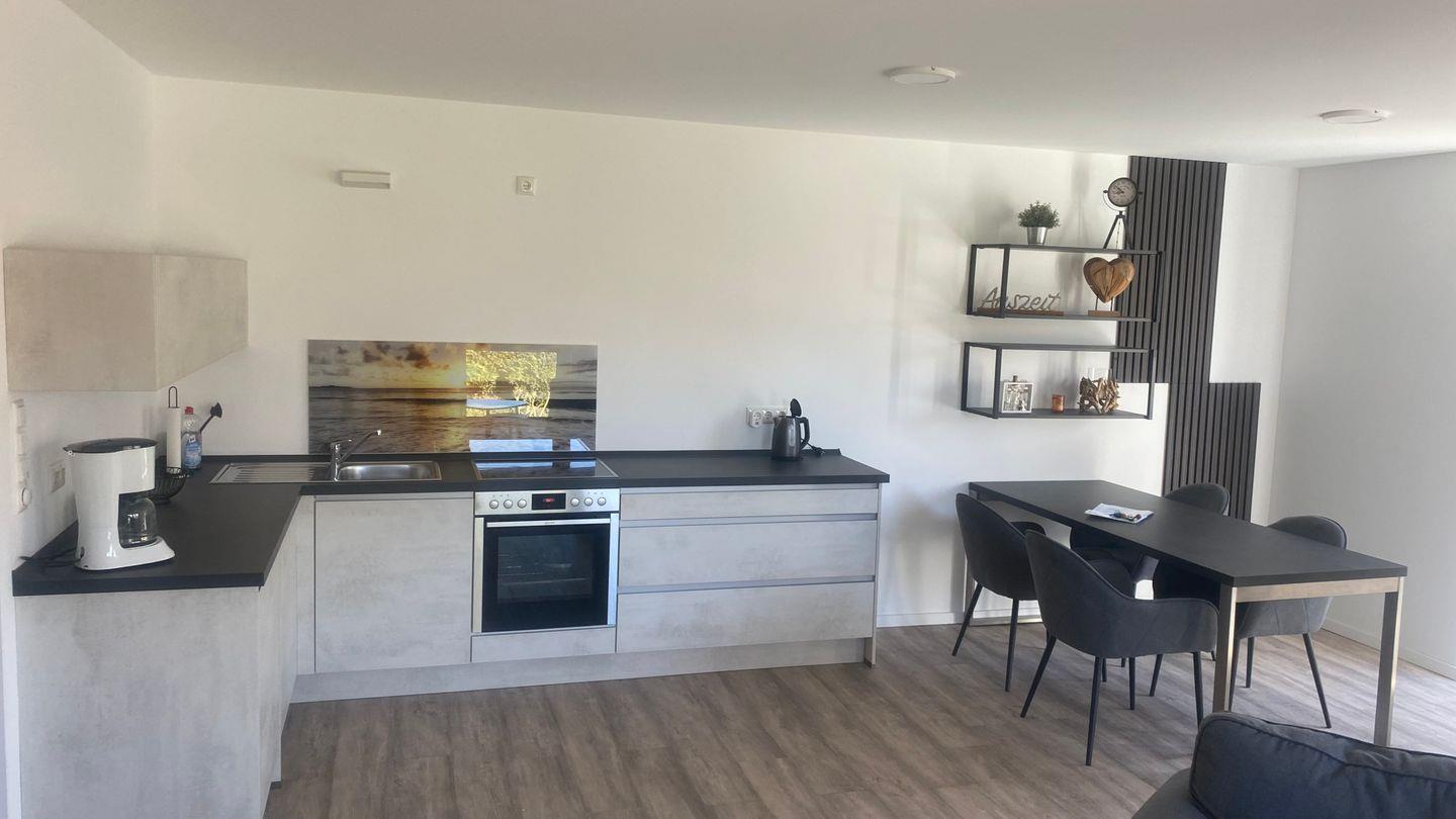 Der offene Wohn- und Essbereich lädt zum Verweilen ein: Auf der rechten Seite sorgt die gemütliche Sofaecke mit Fernseher und Blick auf den möblierten Balkon für entspannte Stunden. Auf der linken Seite befindet sich die voll ausgestattete Küchenzeile – hier können Sie Ihre Lieblingsgerichte zubereiten und anschließend am Esstisch mit vier Stühlen in geselliger Runde genießen.