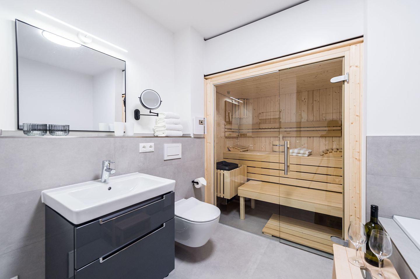 Sie ist für bis zu 4 Personen (der angegebene Preis bezieht sich immer auf 2 Erwachsene und 2 Kinder, extra Personen können ggf. auf Anfrage dazu gebucht werden) buchbar (2 Schlafzimmer mit Doppelbetten 180 x 200 cm) und verfügt über eine gehobene 5-Sterne-Ausstattung: 2 Badezimmer, 1 Sauna, 1 Whirlwanne sowie 1 Balkon (frontaler Meerblick). Die Küche ist komplett ausgestattet und bietet einen großen Esstisch für bis zu 6 Personen. Zudem gibt es einen Geschirrspüler, einen Kühlschrank inkl. Gefrierfach, eine Mikrowelle sowie einen Waschtrockner. Im Wohnbereich erwartet
