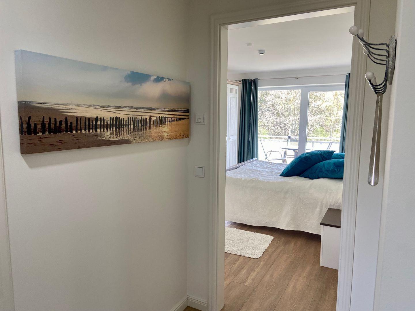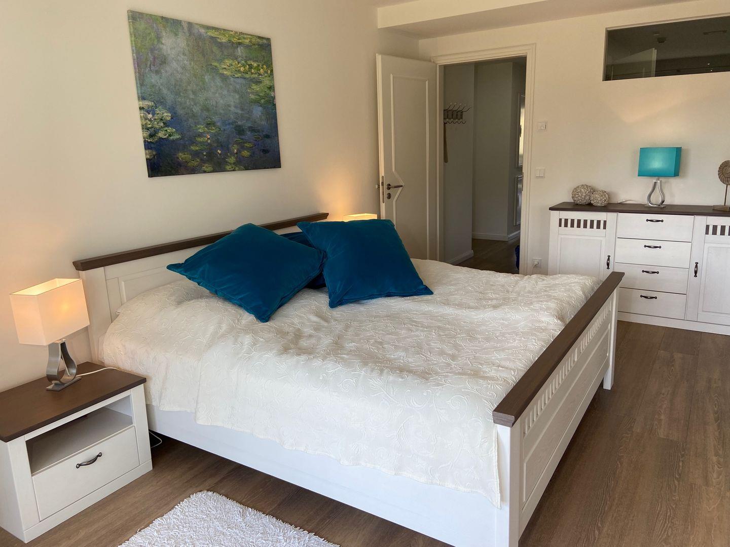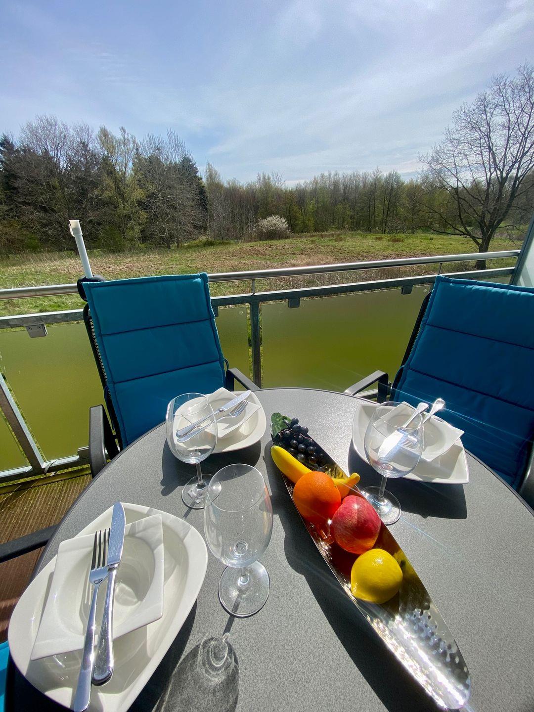 Das helle, elegante Schlafzimmer hat ein Doppelbett (2 x 90x200 cm) mit einem großen Kleiderschrank und Zugang zum Balkon zur Ostseite, auf der Sie schon morgens gemütlich eine Tasse Kaffee in der Sonne trinken können. Die voll ausgestattete Küche mit einem "Vita fresh" - Kühlschrank, Backofen und Mikrowelle ist zum Essbereich offen gestaltet und ein geschmackvoll eingerichteter Wohnraum mit Schlafsofa ( für eine Person geeignet) runden diese Wohnung ab. Der 2. Balkon führt vom Wohnzimmer zur Westseite der Wohnung. Hier genießen Sie die Abendsonne. Von beiden Balkonen haben Sie einen spektakulären Blick in die Natur und auf den Golfplatz.