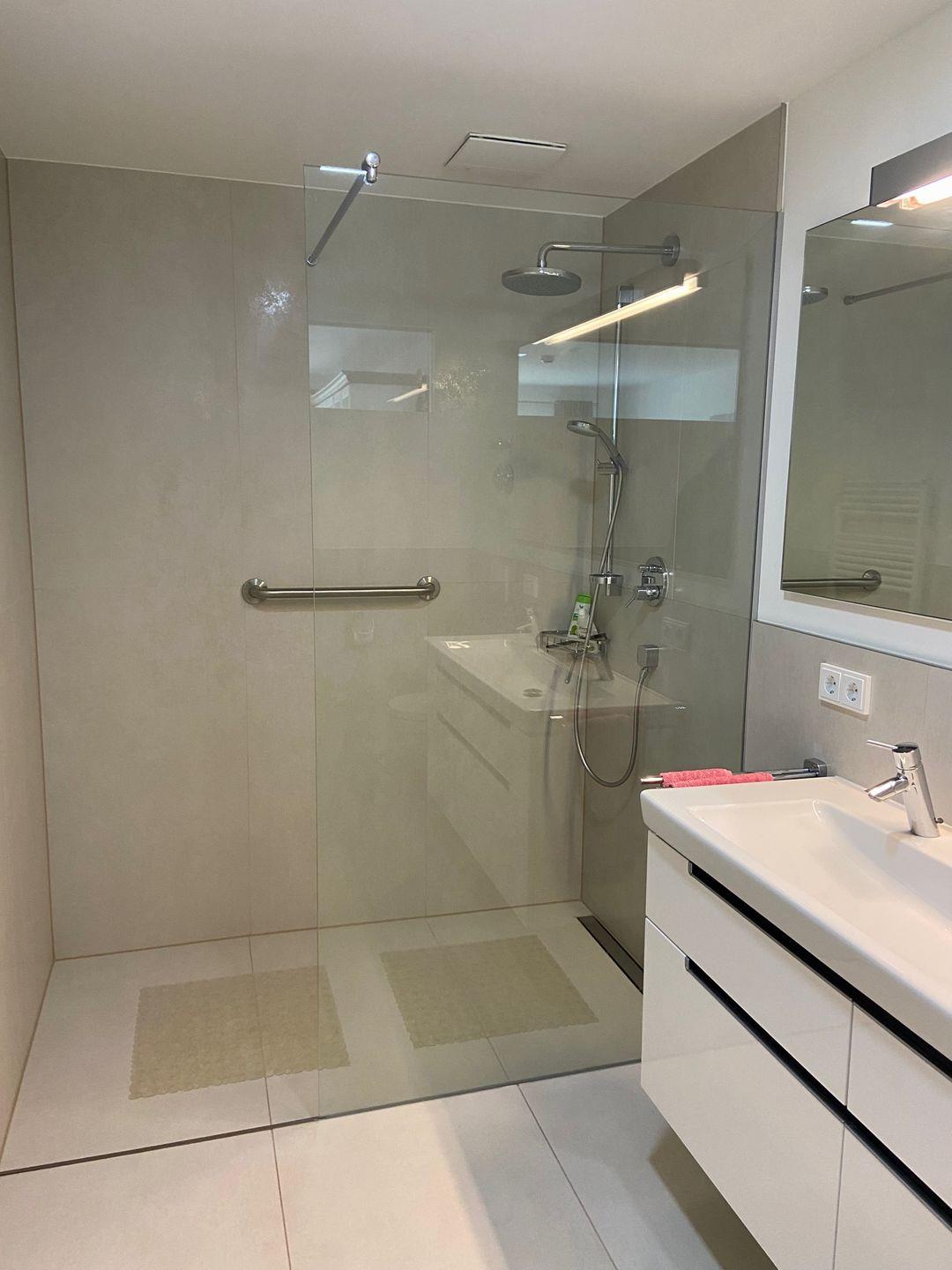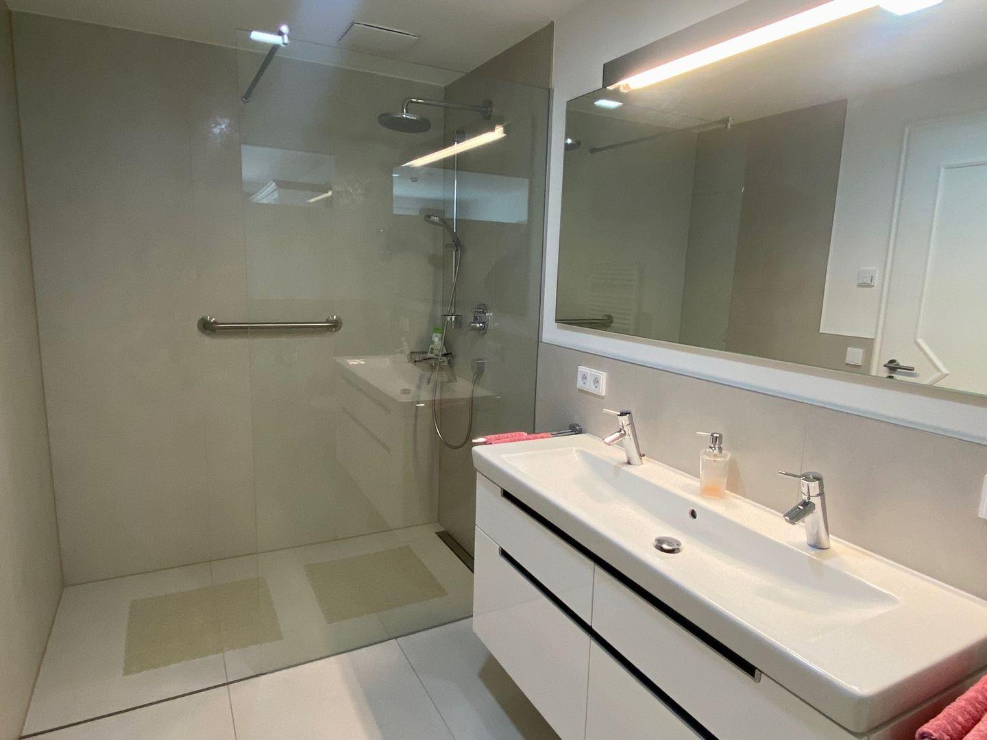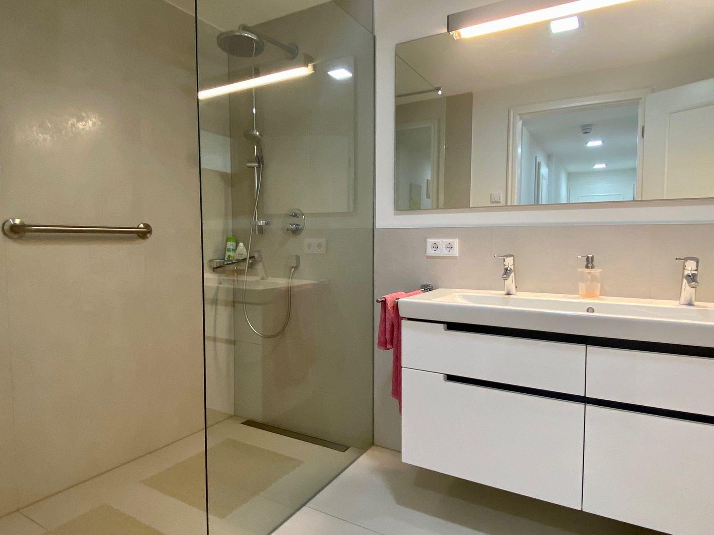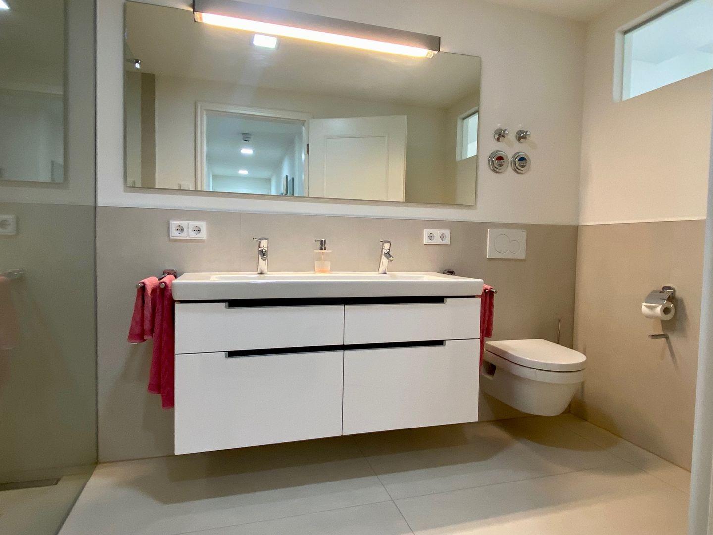 Ein großes Badezimmer mit Raindance-Dusche und Doppelwaschbecken sind selbstverständlich. Außerdem verfügt die Wohnung über ein Gäste-WC mit Waschmaschine.