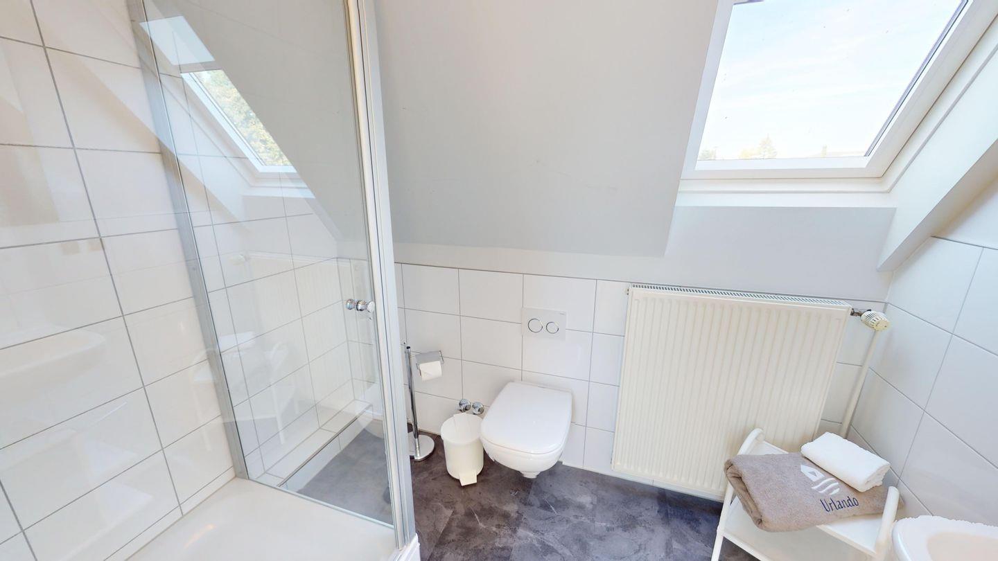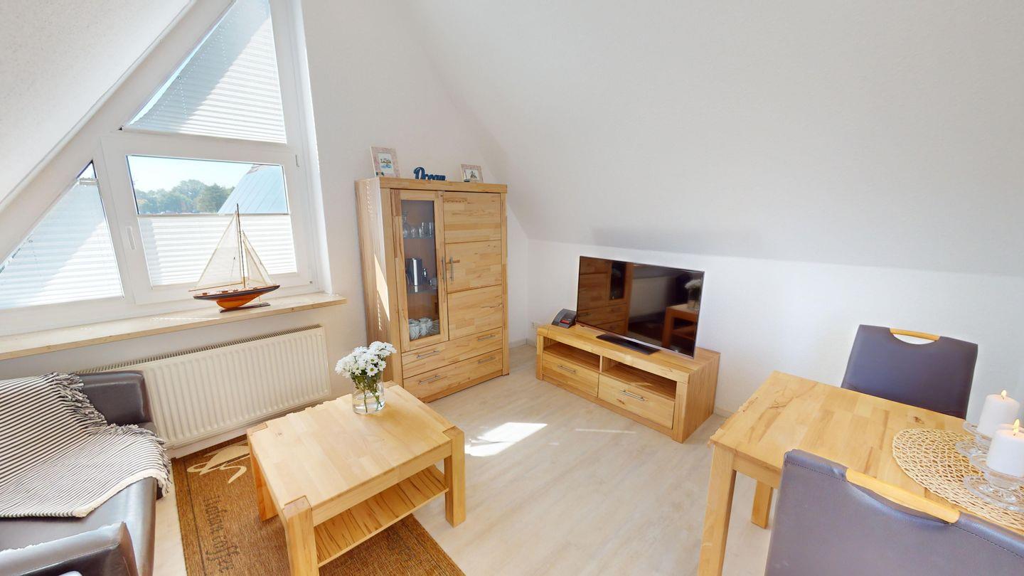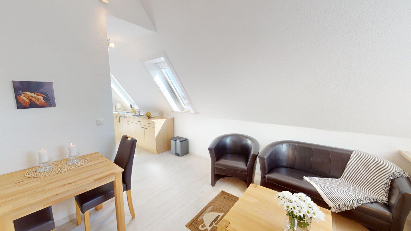 Ein Wohnzimmer, eine in die Schräge integrierte Küchenzeile mit Mikrowelle (+Grillfunktion), ein Schlafzimmer mit Doppelbett und ein Duschbad sind in dieser Wohnung vorhanden.