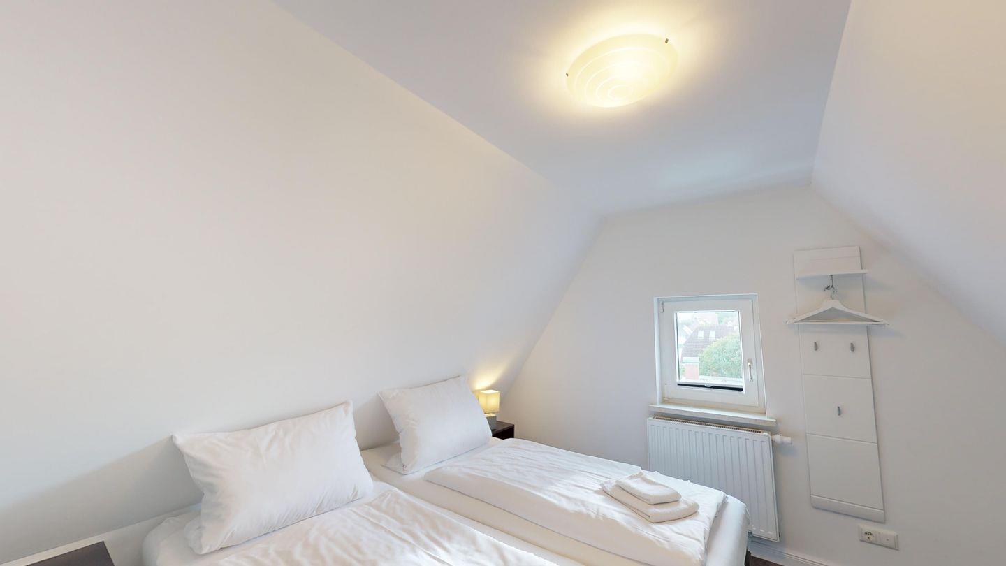 Im Dachgeschoss ist ein weiteres Schlafzimmer mit Doppelbett, Fernseher und zusätzlich einem Holz-Babybett (60 x 120 cm) sowie das vierte Schlafzimmer mit zwei getrennt stehenden Betten und Fernseher.