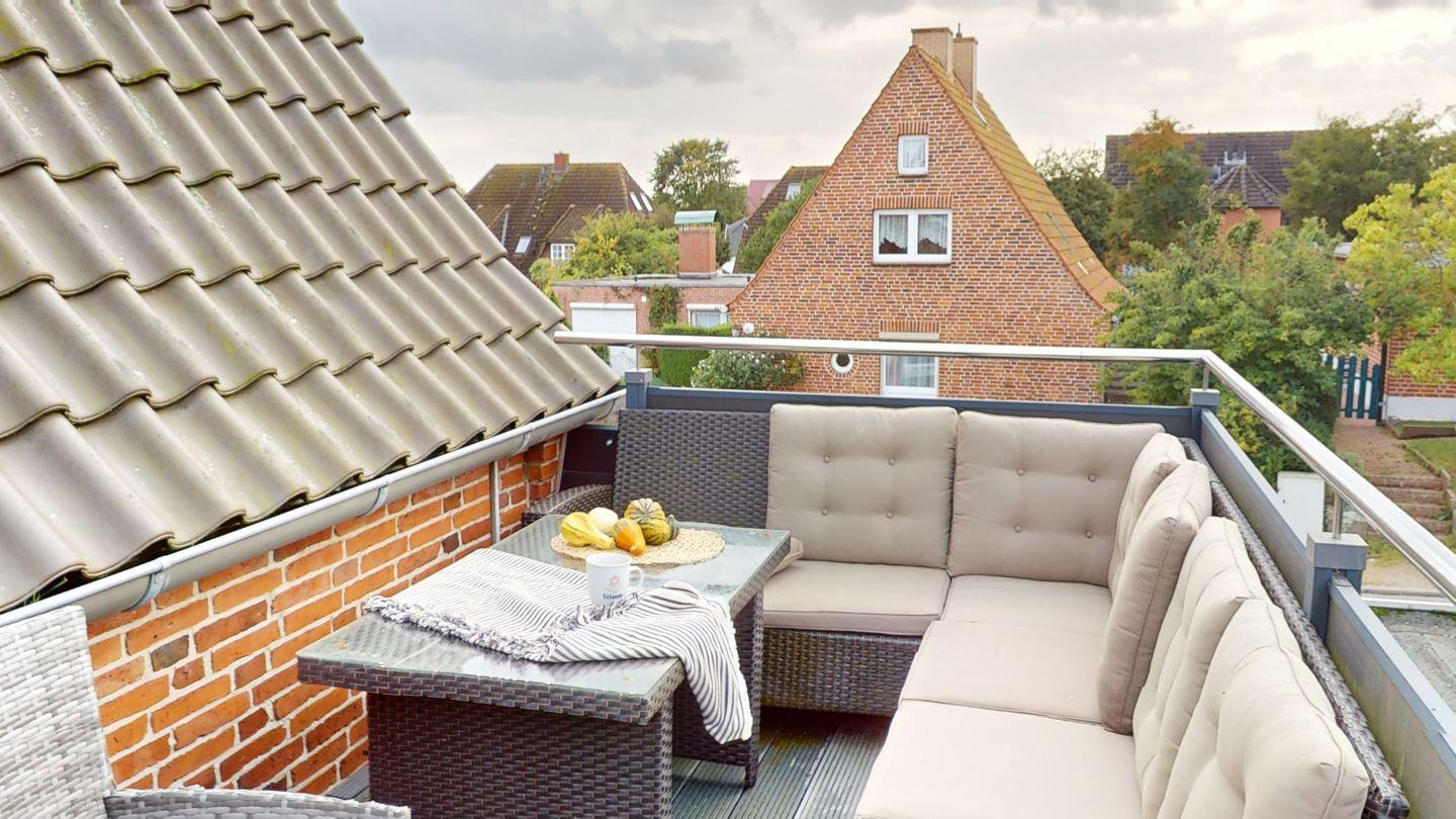 Der wunderschöne Balkon ist vom Wohnzimmer aus über eine kleine Treppe zu erreichen. Bis in die Abendstunden scheint hier die Sonne. Der liebevoll angelegte Gemeinschaftsgarten mit Grillplatz sowie die gemeinschaftlich genutzte Sauna im Haus sind weitere Highlights dieser Ferienwohnung.
