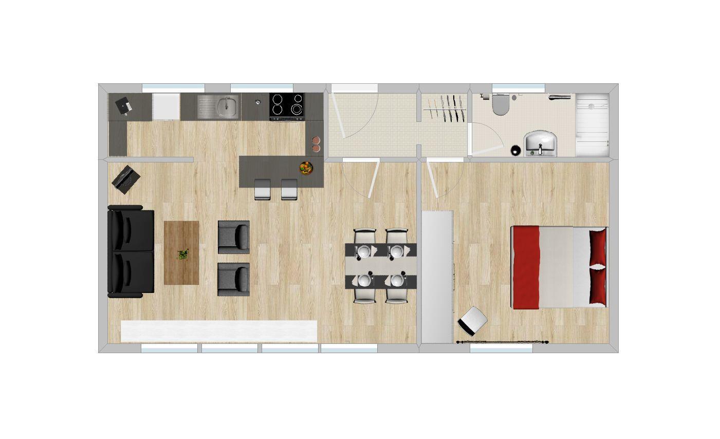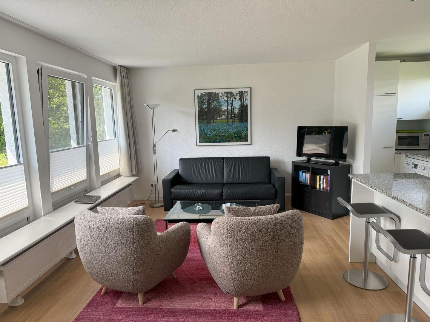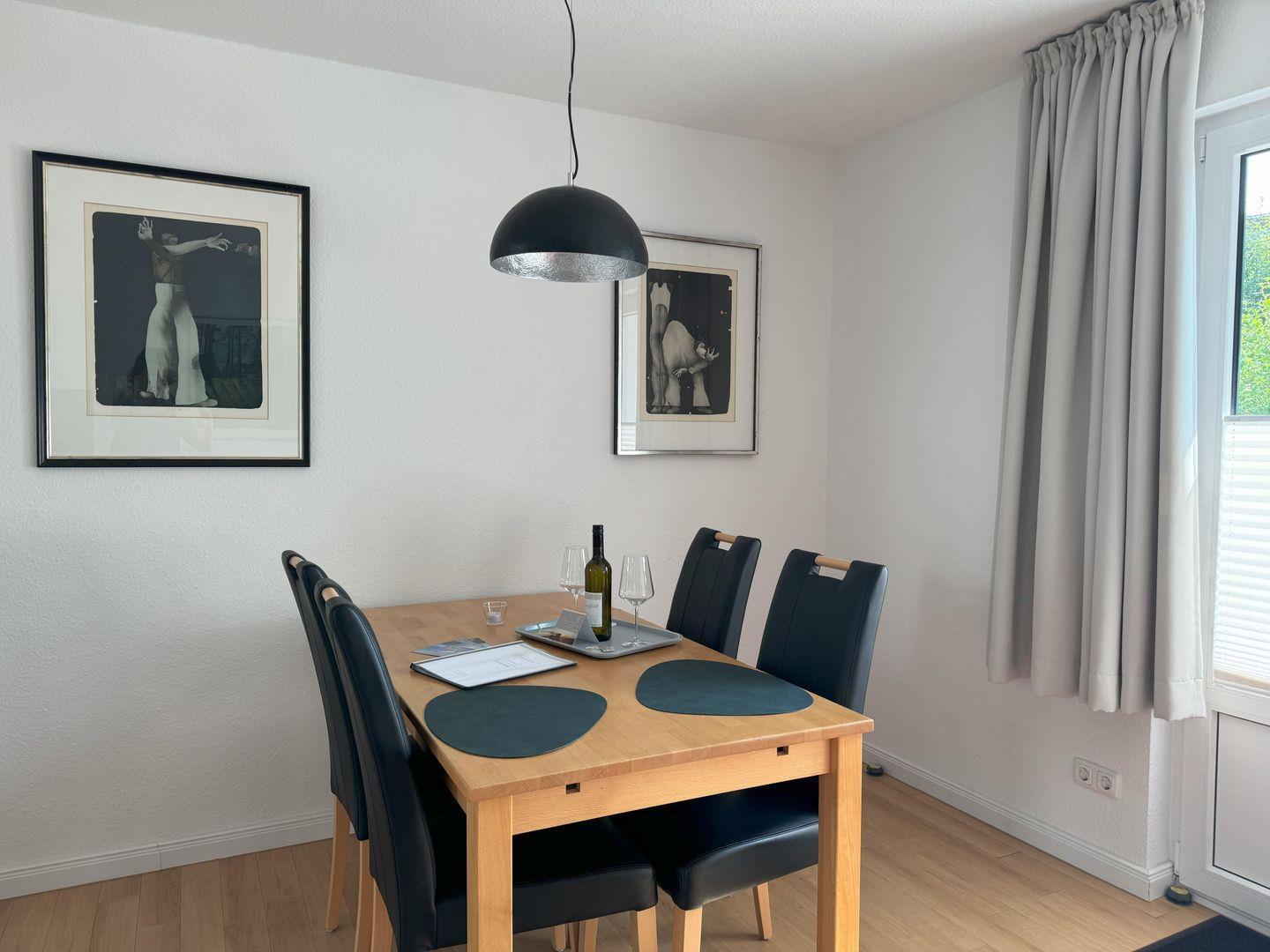 Sie betreten den Bungalow auf der Nordostseite. Ein kleiner Flur mit Garderobe führt in den Wohnraum (24 qm). Eine gemütliche Sitzgarnitur aus schwarzem Leder steht vor dem großen Fensterbereich zu Terrasse und Garten. Der Essbereich befindet sich auf der anderen Seite des Raums, von dem aus einer Tür zur Terrasse führt. Die Ausstattung umfasst u.a. ein TV-Gerät mit Flat-Screen (Satellit) und eine Audioanlage mit CD-Spieler und Radio.