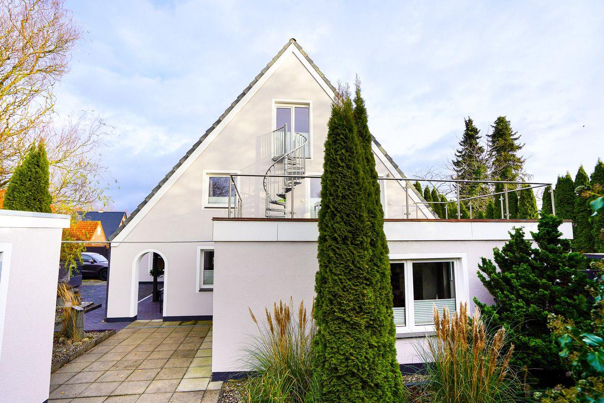 Die Ferienwohnung im 1. OG bietet ein Schlafzimmer mit großem Boxspringbett und ein Wohnzimmer mit Pantryküche. Zur Ausstattung gehören Herd, Geschirrspüler, Kühlschrank, Mikrowelle und eine moderne Echtglasdusche im Bad. Entspannen Sie in der hauseigenen Wellnesslounge mit Sauna und Outdoor-Whirlpool oder auf der Dachterrasse mit eigenem Strandkorb. Kostenloses W-LAN ist verfügbar, und im "Waschhaus" stehen Waschmaschine, Trockner bereit. Nichtraucher-Unterkunft, Haustiere erlaubt.