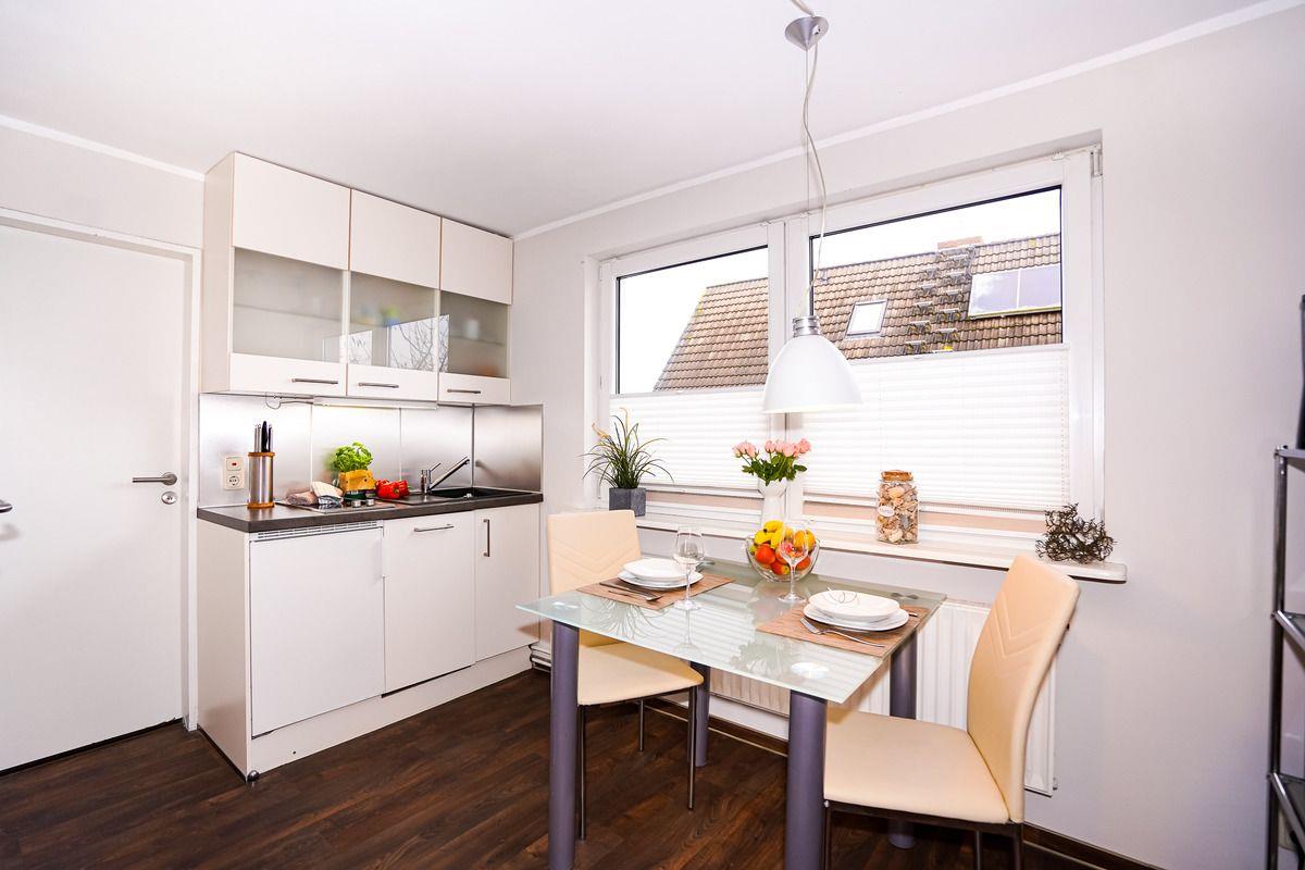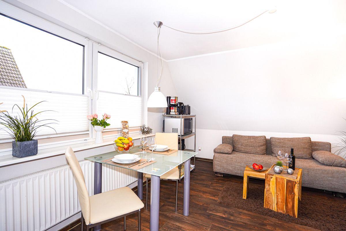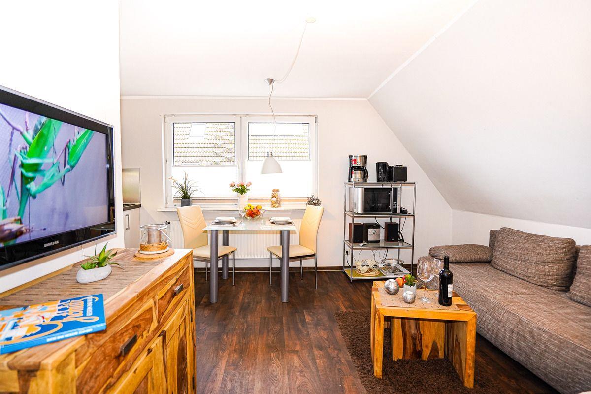 Die Wohnung befindet sich 1. OG und verfügt über ein Schlafzimmer mit einem großen und bequemen Boxspringbett. Das Wohnzimmer mit einer kleinen Pantryküche lädt zum Entspannen, nach einem aufregenden Tag am Strand, ein. In der Küchenzeile finden Sie einen Herd mit zwei Cerankochfeldern, eine Geschirrspülmaschine, einen Kühlschrank mit Gefrierfach und eine Mikrowelle mit Backfunktion. Ein trendiges Bad mit großzügiger Echtglasdusche und Tageslicht rundet Ihre Ferienwohnung ab.