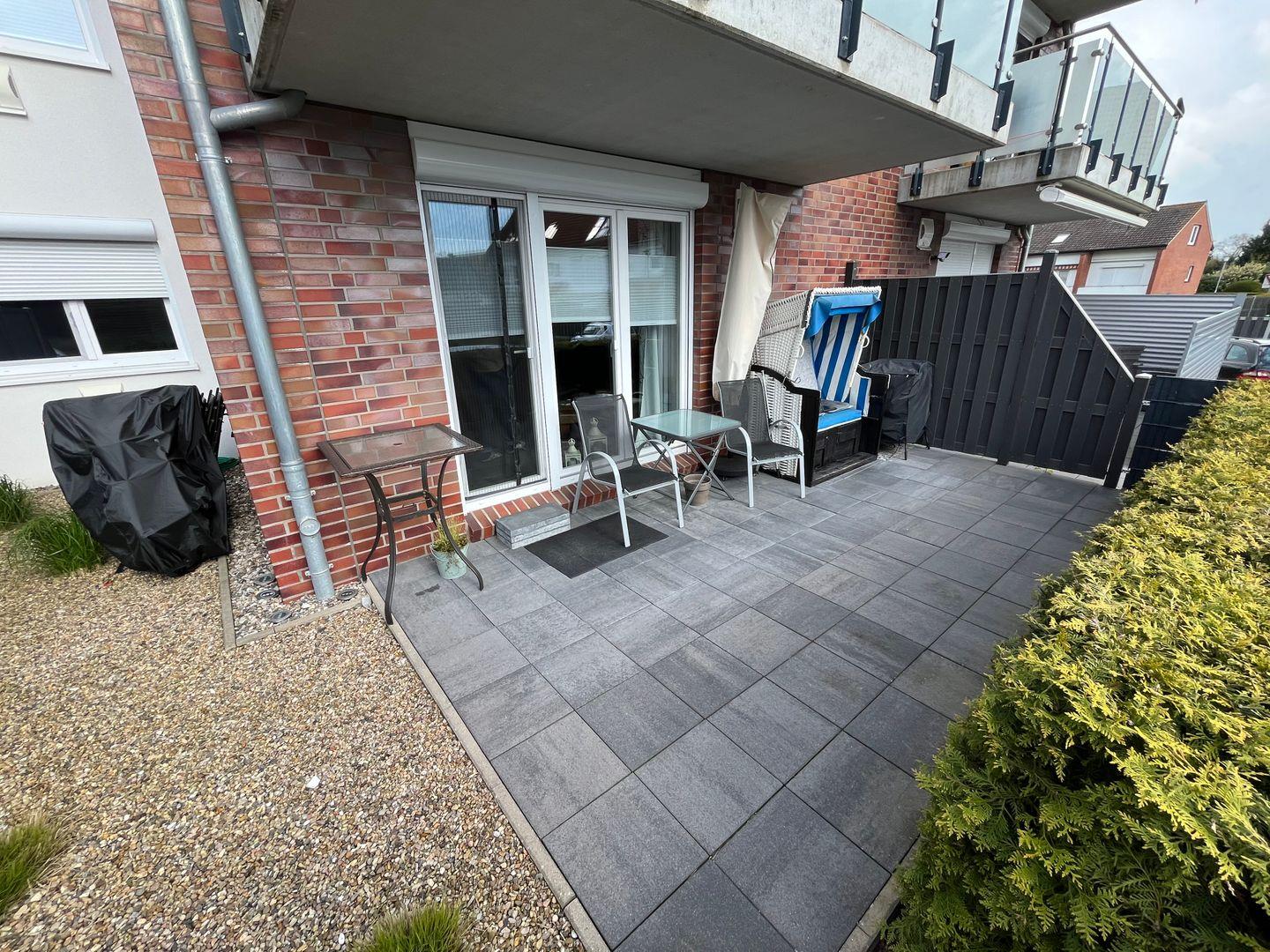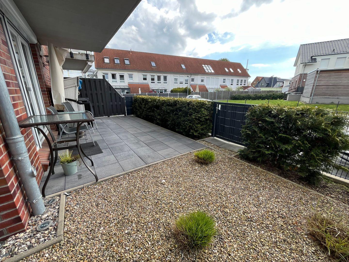 Vom Wohnzimmer gelangen Sie zur eingezäunten Terrasse mit Gartenmöbeln und Strandkorb, von hier gelangen Sie auch durch eine Pforte direkt zum Parkplatz.