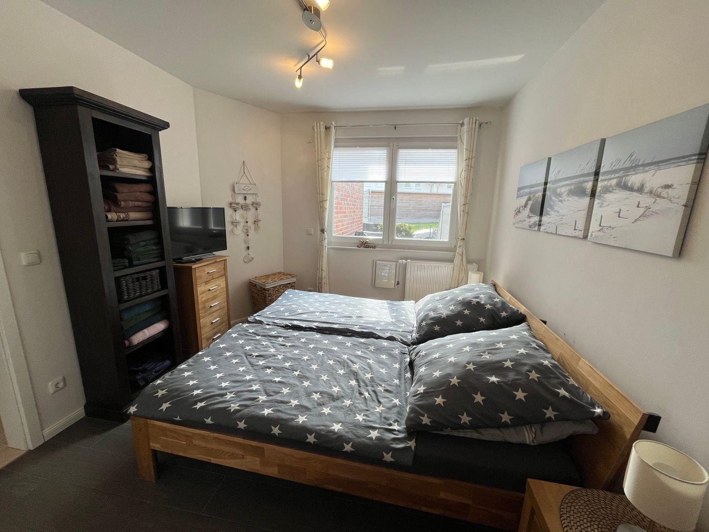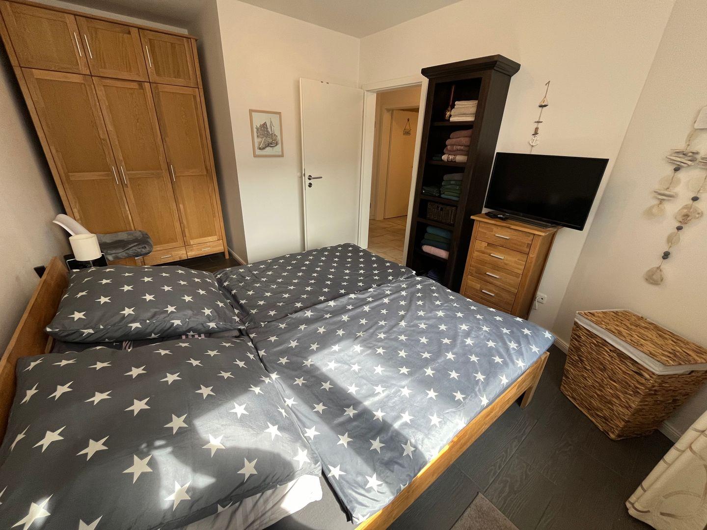 Das Schlafzimmer ist mit einem Doppelbett (2x90cm x 200cm), einem Kleiderschrank und einem zusätzlichem Flachbildschirm möbliert. Schlafzimmer und Wohnzimmer verfügen über elektrische Außenjalousien.