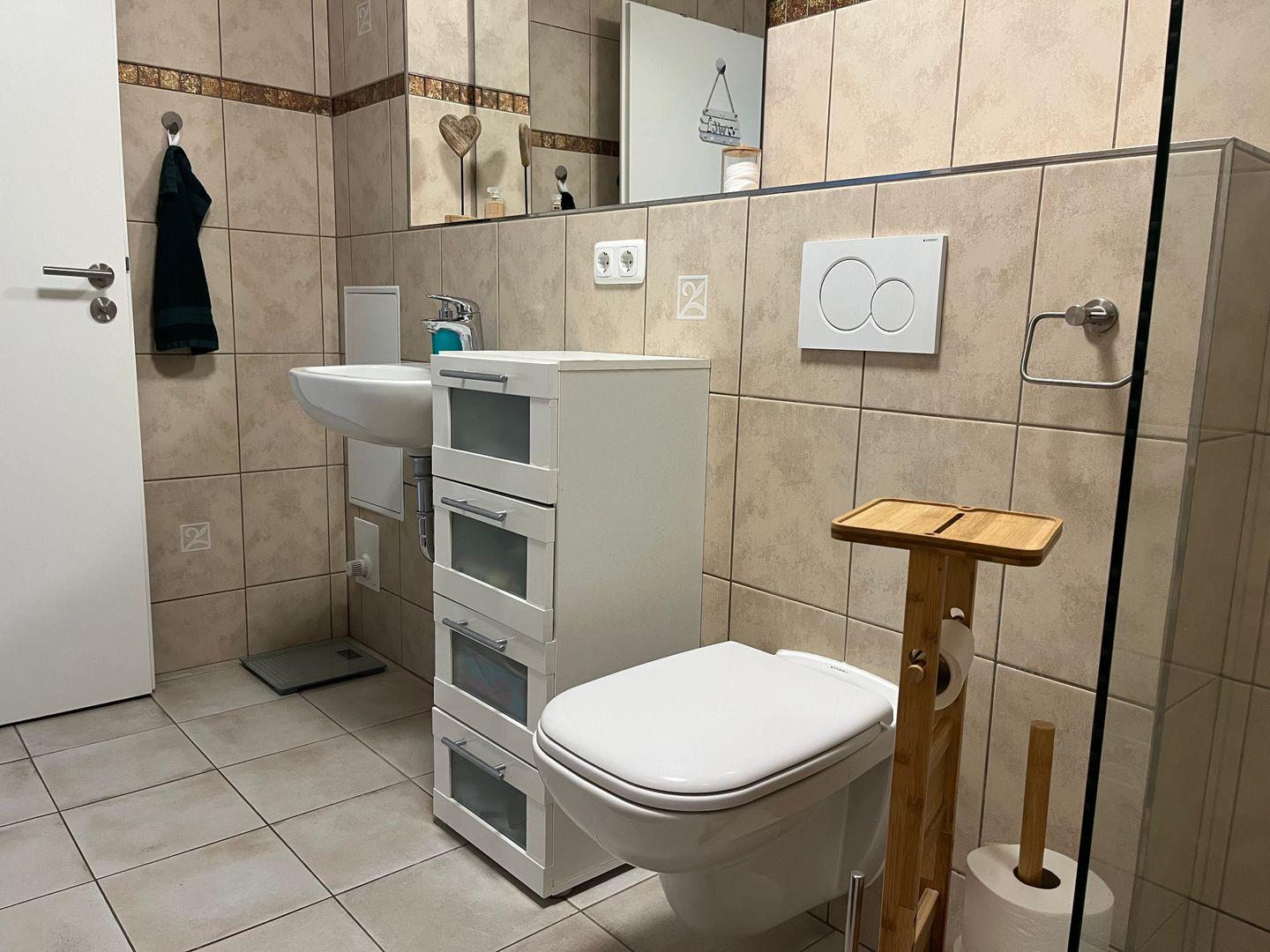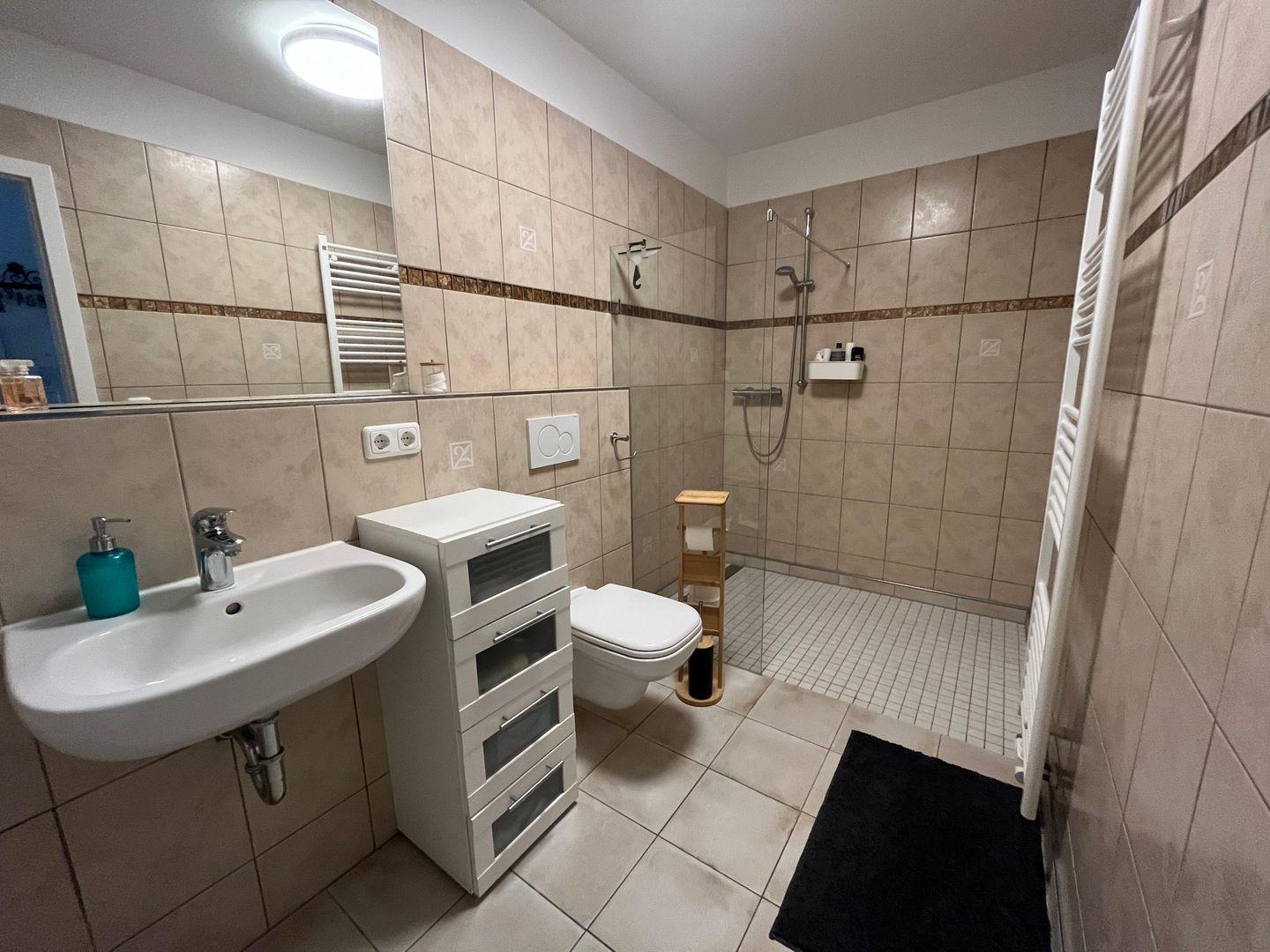 Das moderne Duschbad mit bodentiefer Dusche bietet Ihnen genügend Platz für Ihre persönlichen Gegenstände.