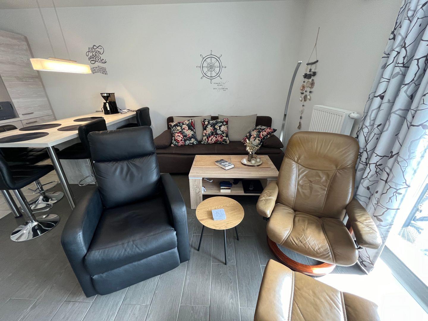 Es erwartet Sie ein großes Wohnzimmer mit einer Couch die sich im Handumdrehen zur Schlafcouch (140 cm breit, für 1 Erwachsenen oder 2 Kinder) umfunktionieren lässt und eine zum Wohnbereich offene, integrierte Küche mit Essbereich.