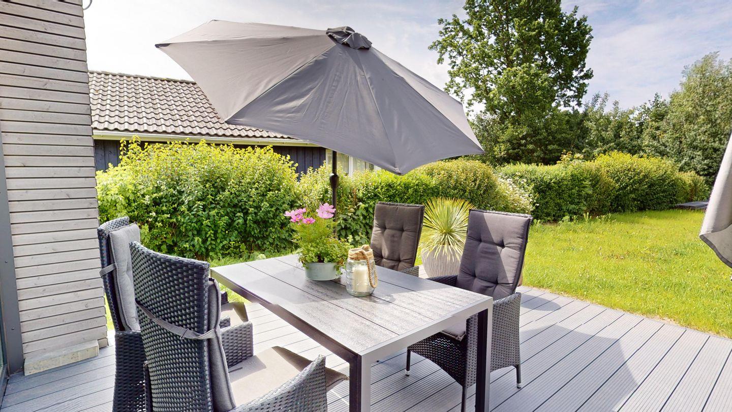 Ihr eigener Garten mit Terrasse sorgt für besondere Urlaubsfreuden, denn Gartenmöbel, Sonnenschirm und ein Elektrogrill gehören zur Ausstattung.