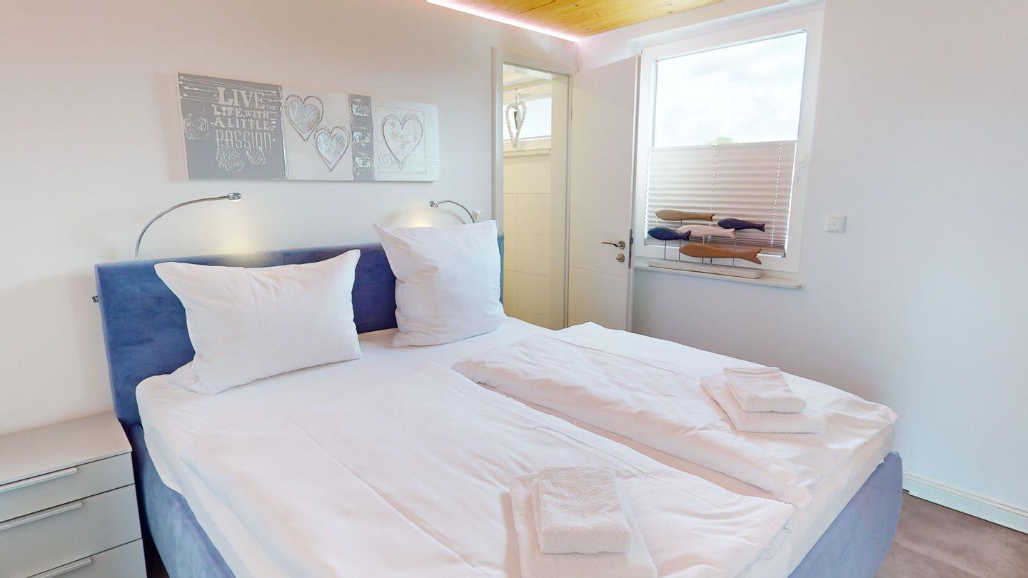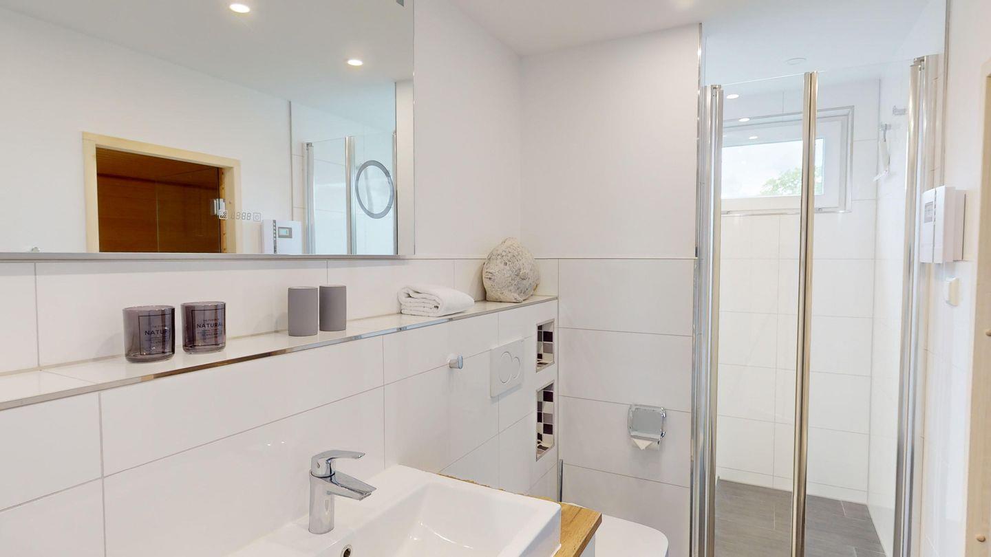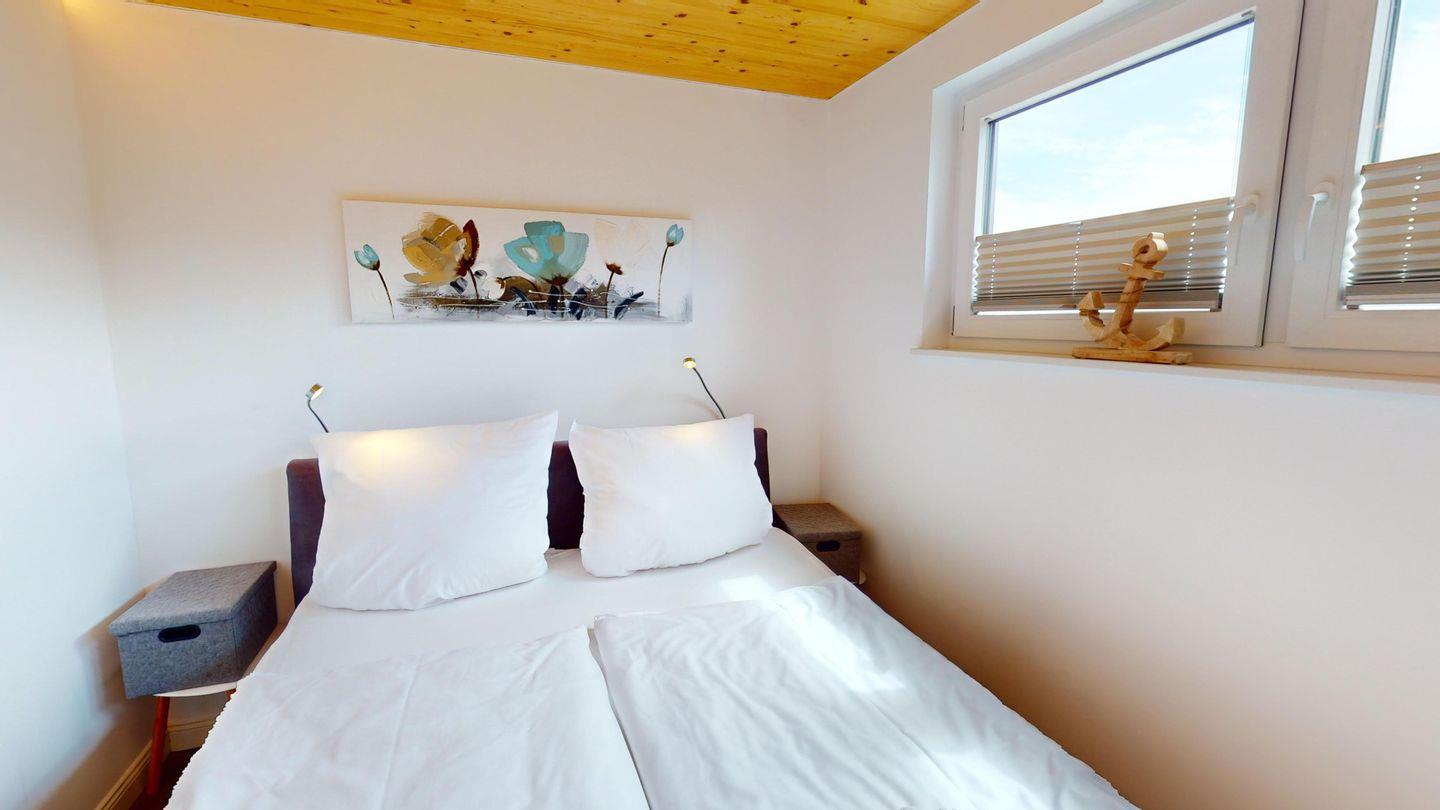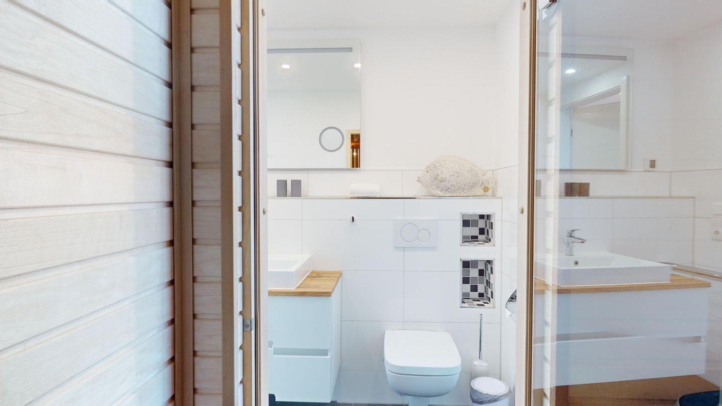 Für die Gäste stehen zwei Schlafzimmer, ein Duschbad sowie ein Gäste-WC (angrenzend an eins der Schlafzimmer) zur Verfügung.