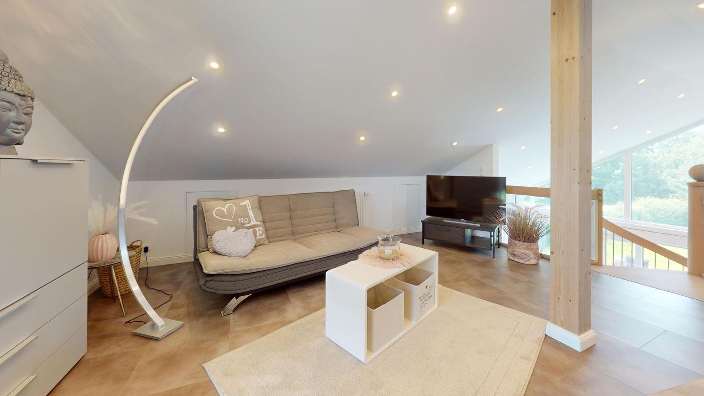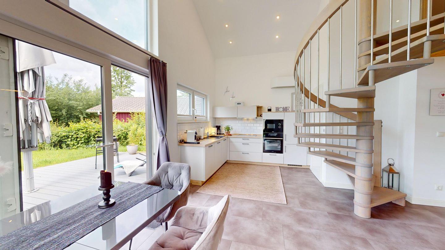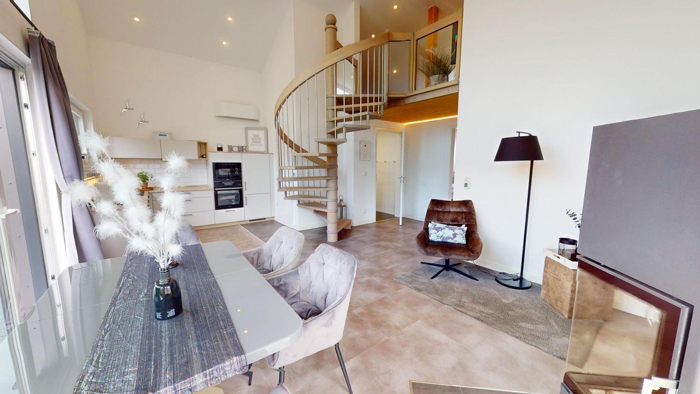 Der große und helle Wohn- und Essbereich mit Sessel und Fernseher sowie der Esstisch und die offene Küche laden zum Erholen ein. Oben auf der Empore relaxen Sie auf modernen Loungemöbeln und hier befindet sich zusätzlich ein zweiter Fernseher.
