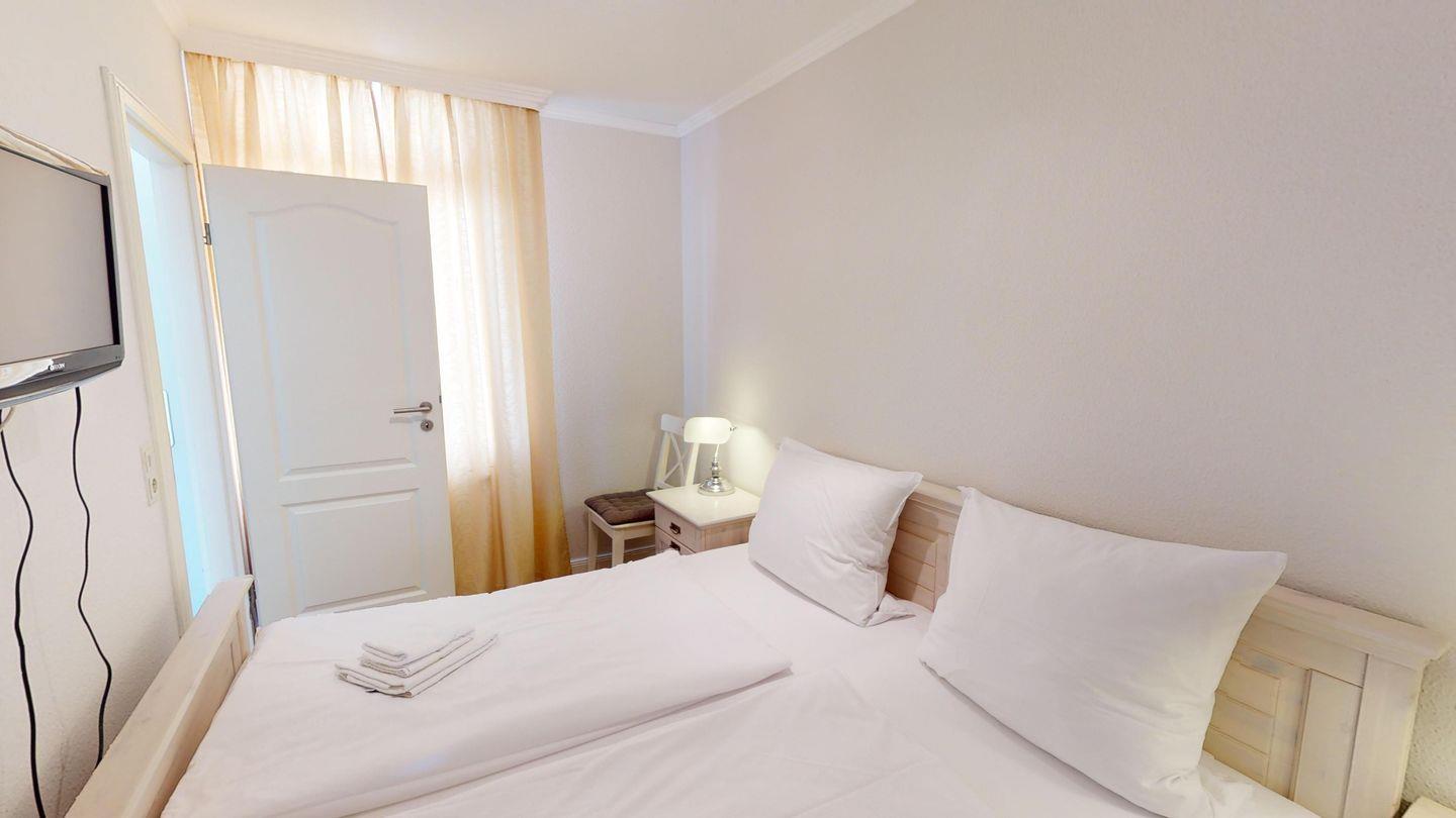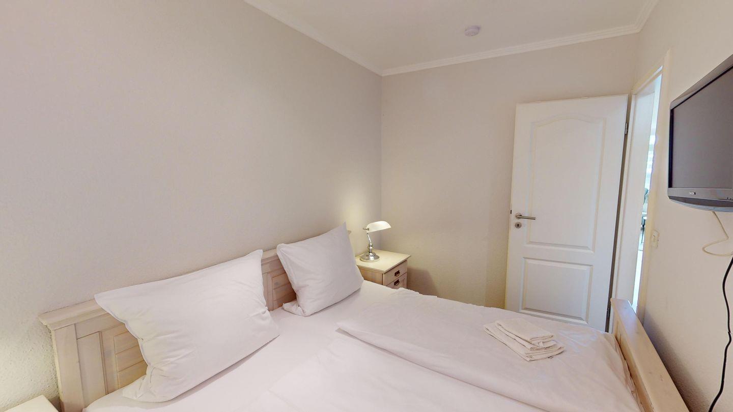 Kernstück der Wohnung ist der helle, offene Wohn- und Essbereich mit neuer, komplett ausgestatteter Küche mit Geschirrspüler. Ein Ecksofa sowie ein gemütlicher Sessel mit Fußteil stehen zur Erholung bereit. Zwei Schlafzimmer (eins mit Doppelbett und Fernseher, eins mit Ausziehbett für Kinder) sowie ein neu gestaltetes Duschbad komplettieren die Ferienwohnung.