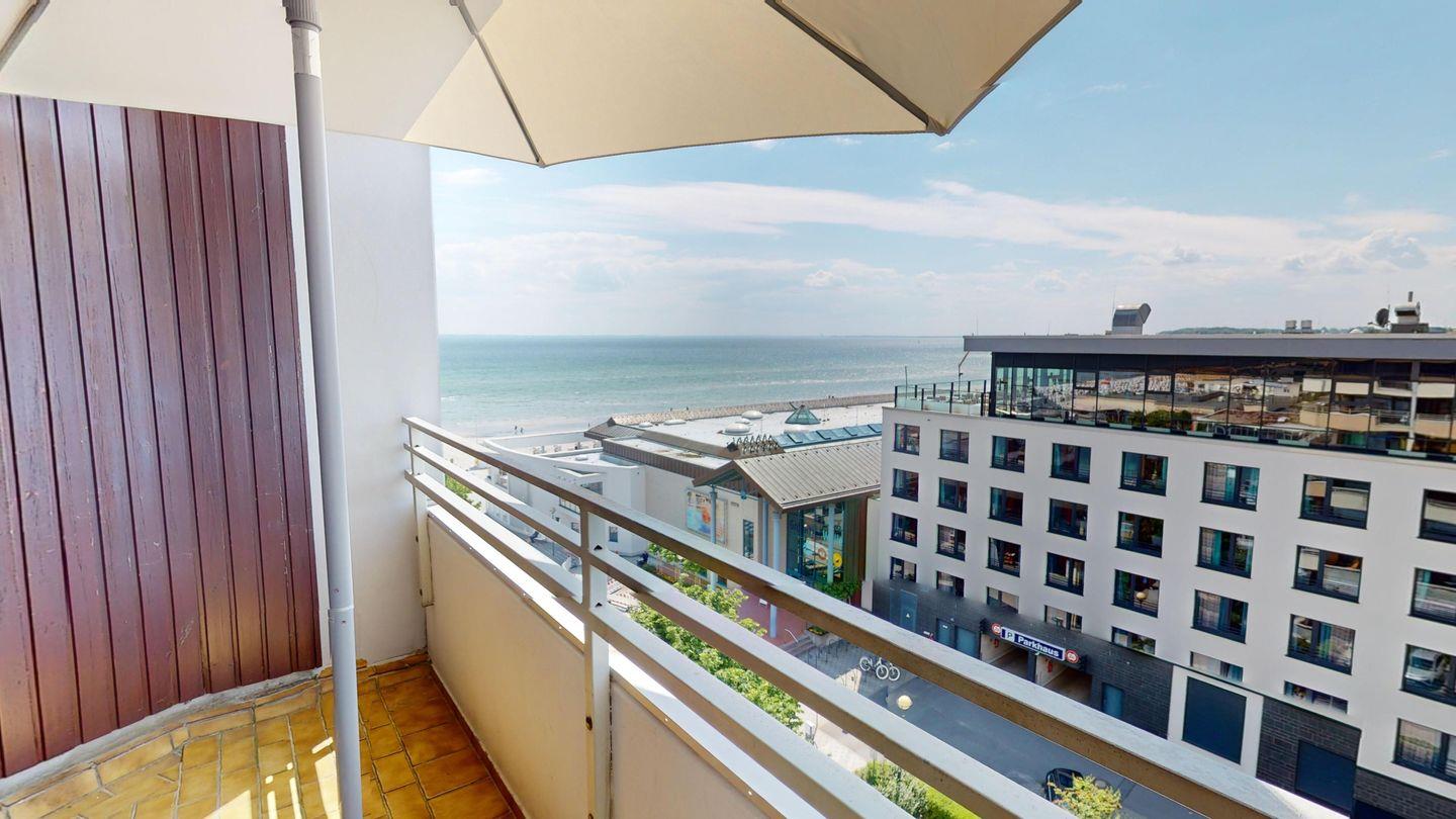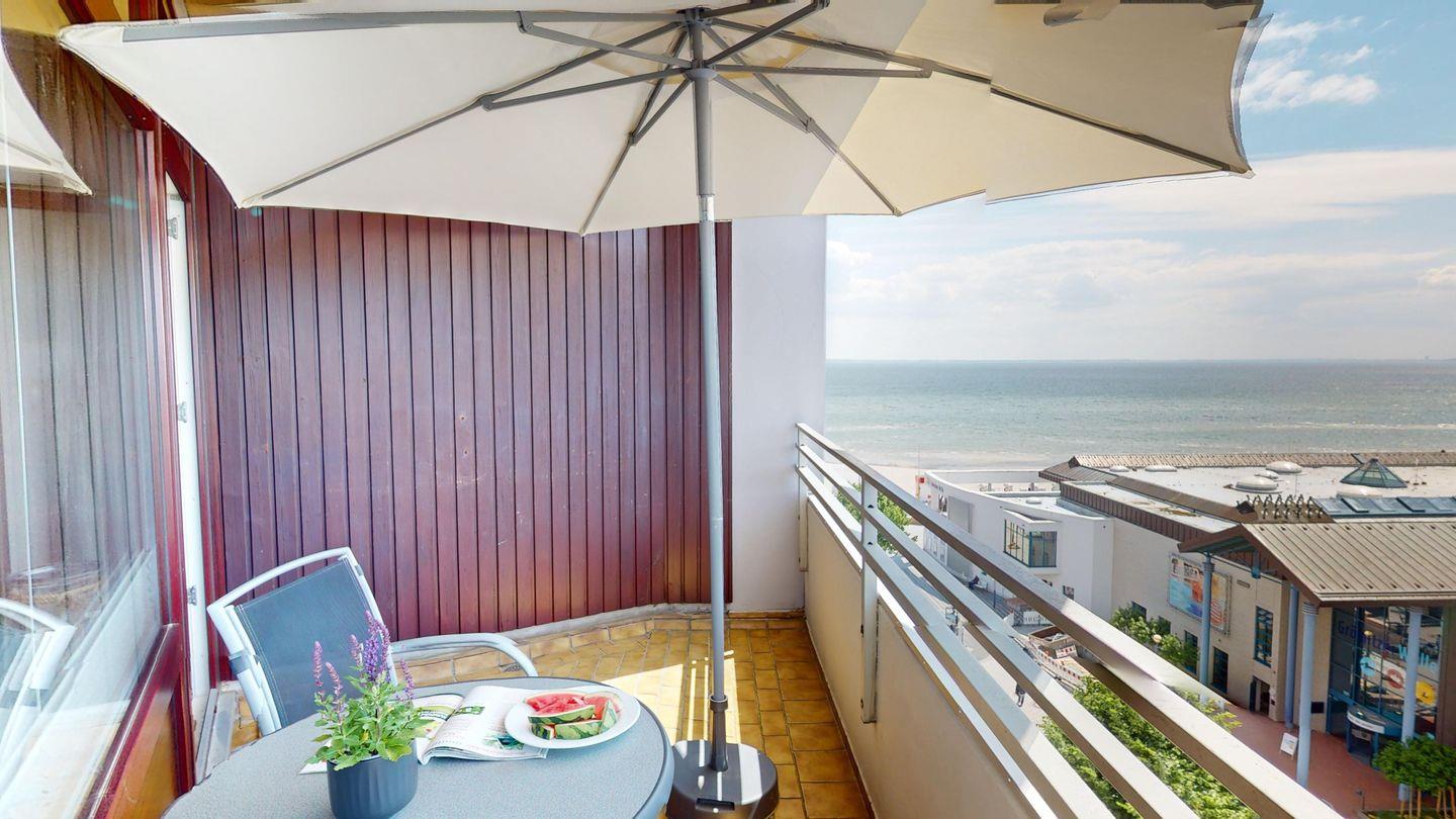 Die 72 m² große Ferienwohnung mit überdachtem Balkon liegt in der 8. Etage des Grömitz-Center. Vom Südwest-Balkon aus hat man einen schönen Meerblick auf die Lübecker Bucht. Zum feinsandigen Strand und der Promenade von Grömitz sind es nur wenige Schritte.