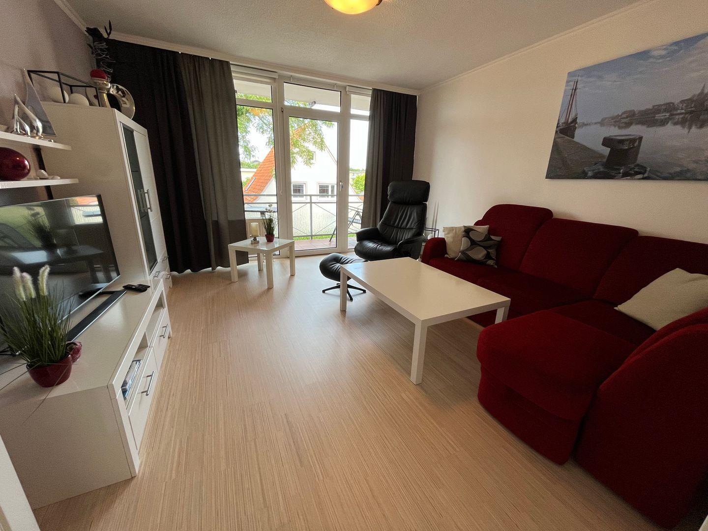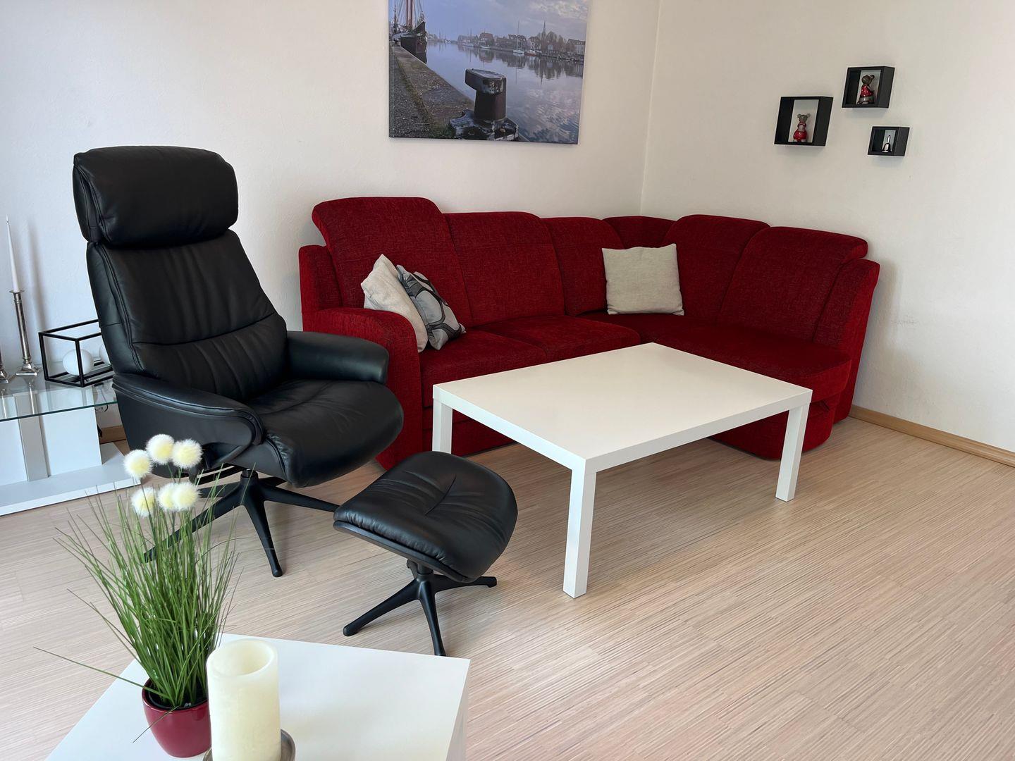 Das gemütliche Wohnzimmer verfügt über eine Schlafcouch (140 cm breit) und einen Sessel.