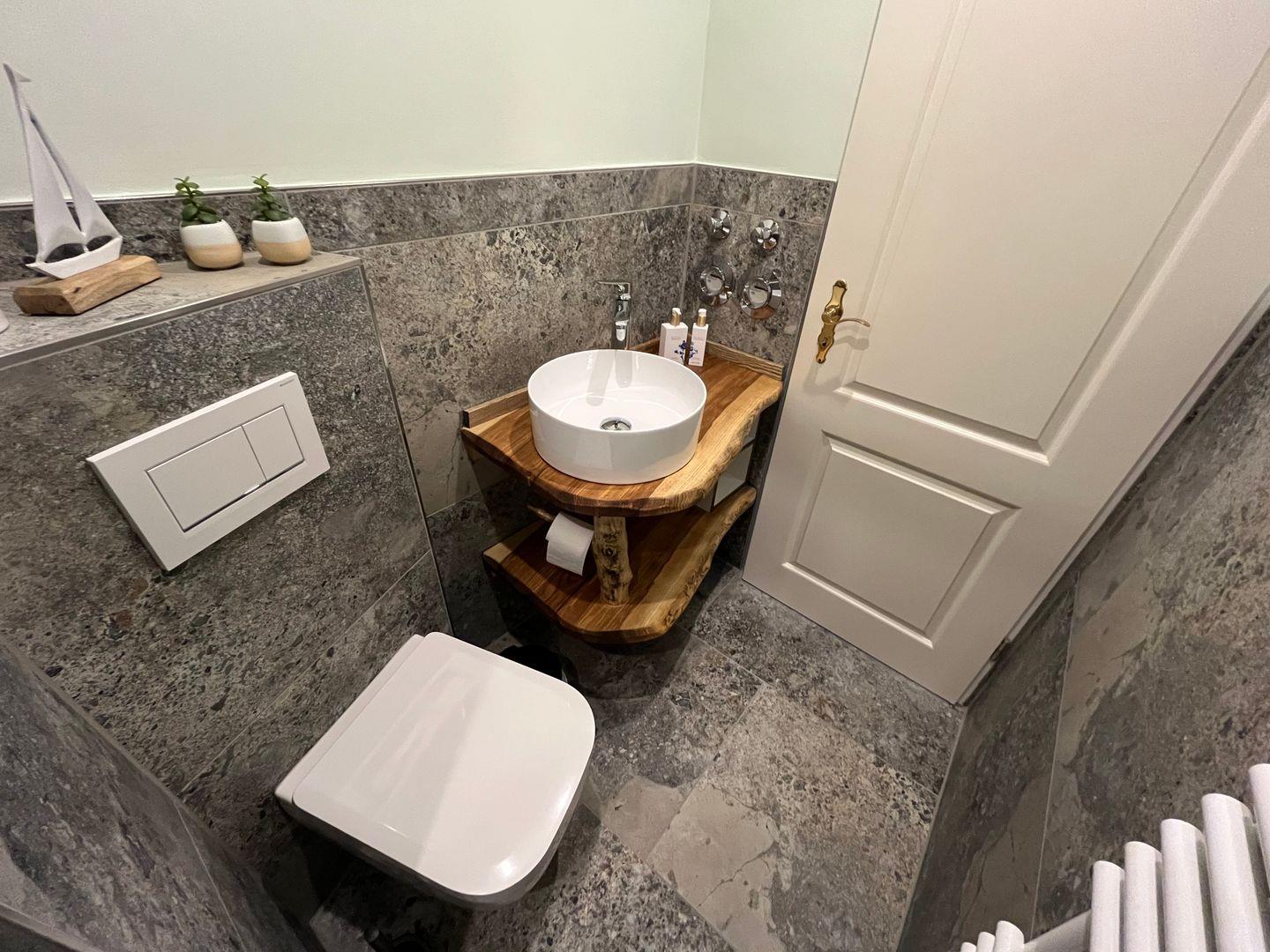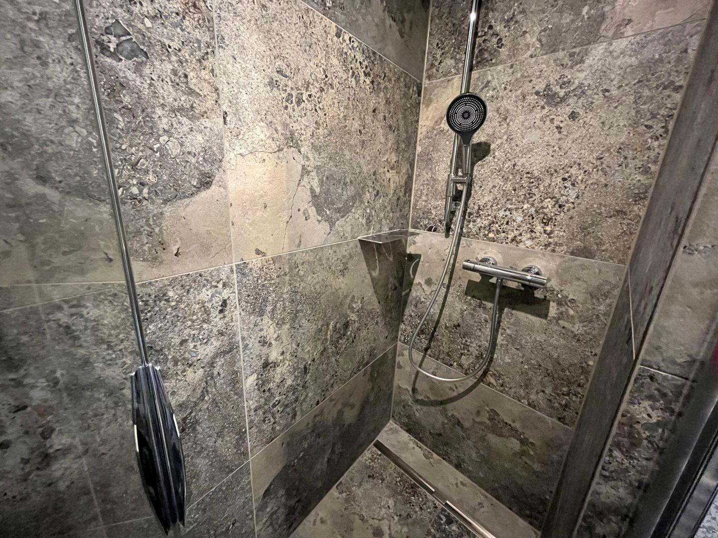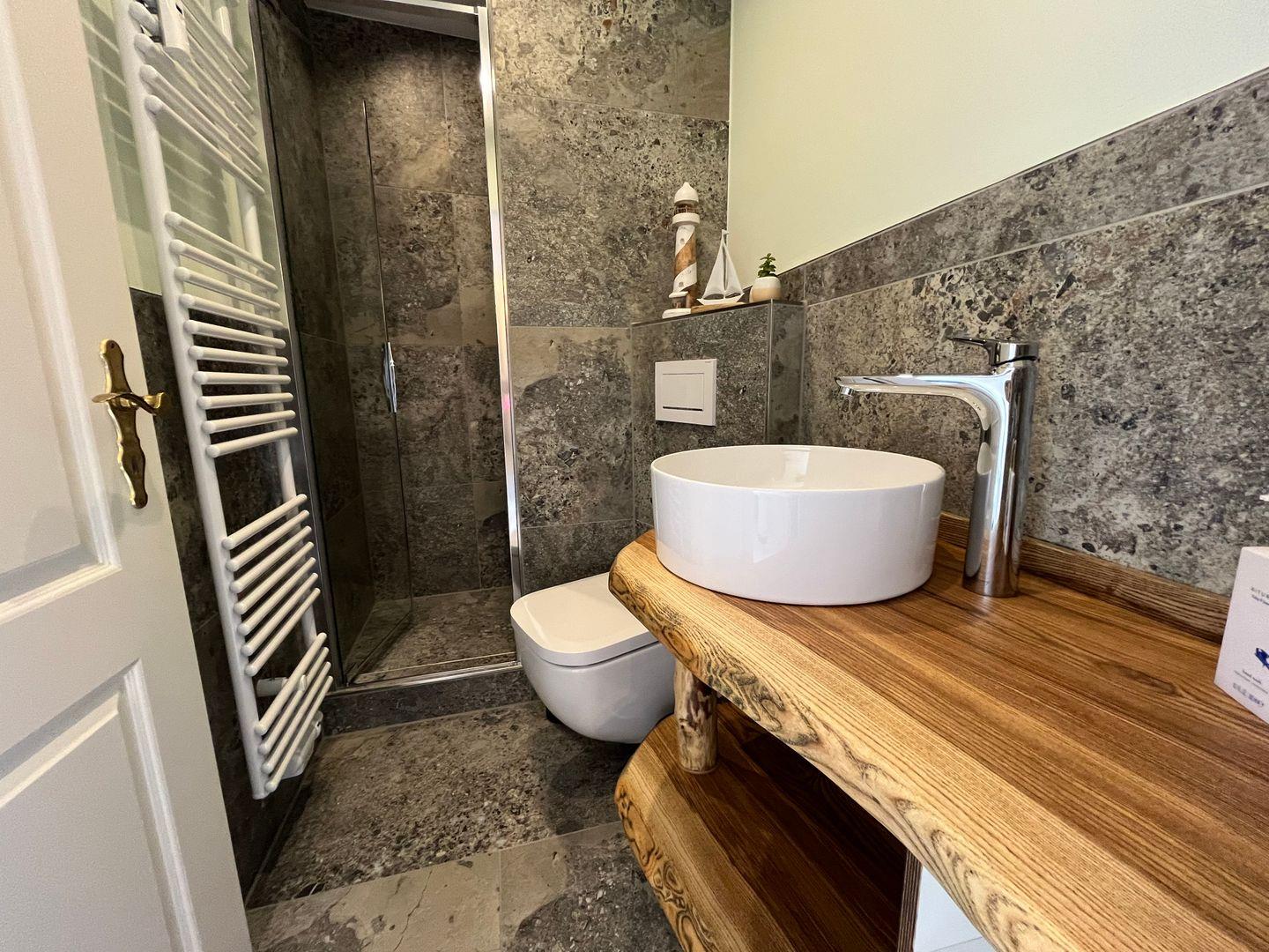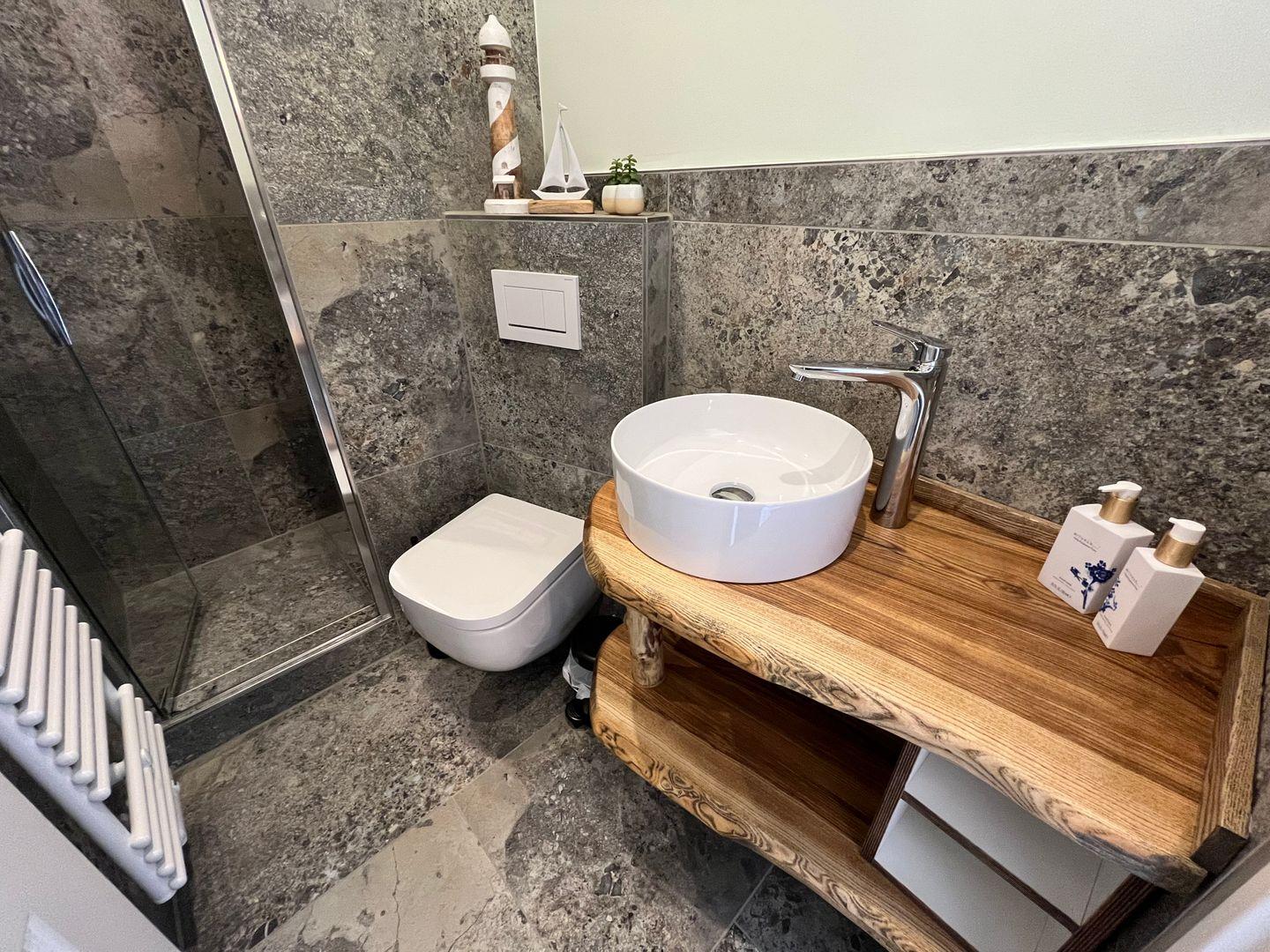 Freuen Sie sich auf ein, in 2024 frisch renoviertes, kleines aber modernes Badezimmer mit Dusche, Föhn und Kosmetikspiegel.