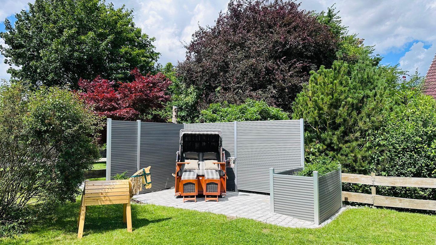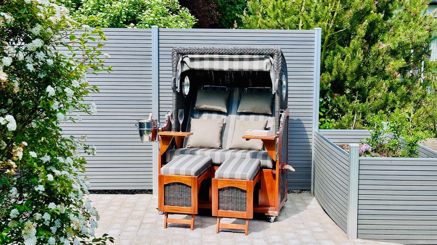Die Wohnung bietet einen eigenen abgeschlossenen Garten mit einer zusätzlichen windgeschützten Terrasse und einem eigenen Strandkorb. Auf dem 15m² großen Balkon in Südwest-Lage sind ein Essplatz für 4 Personen, ein Elektro-Grill und bequeme Liegen vorhanden.