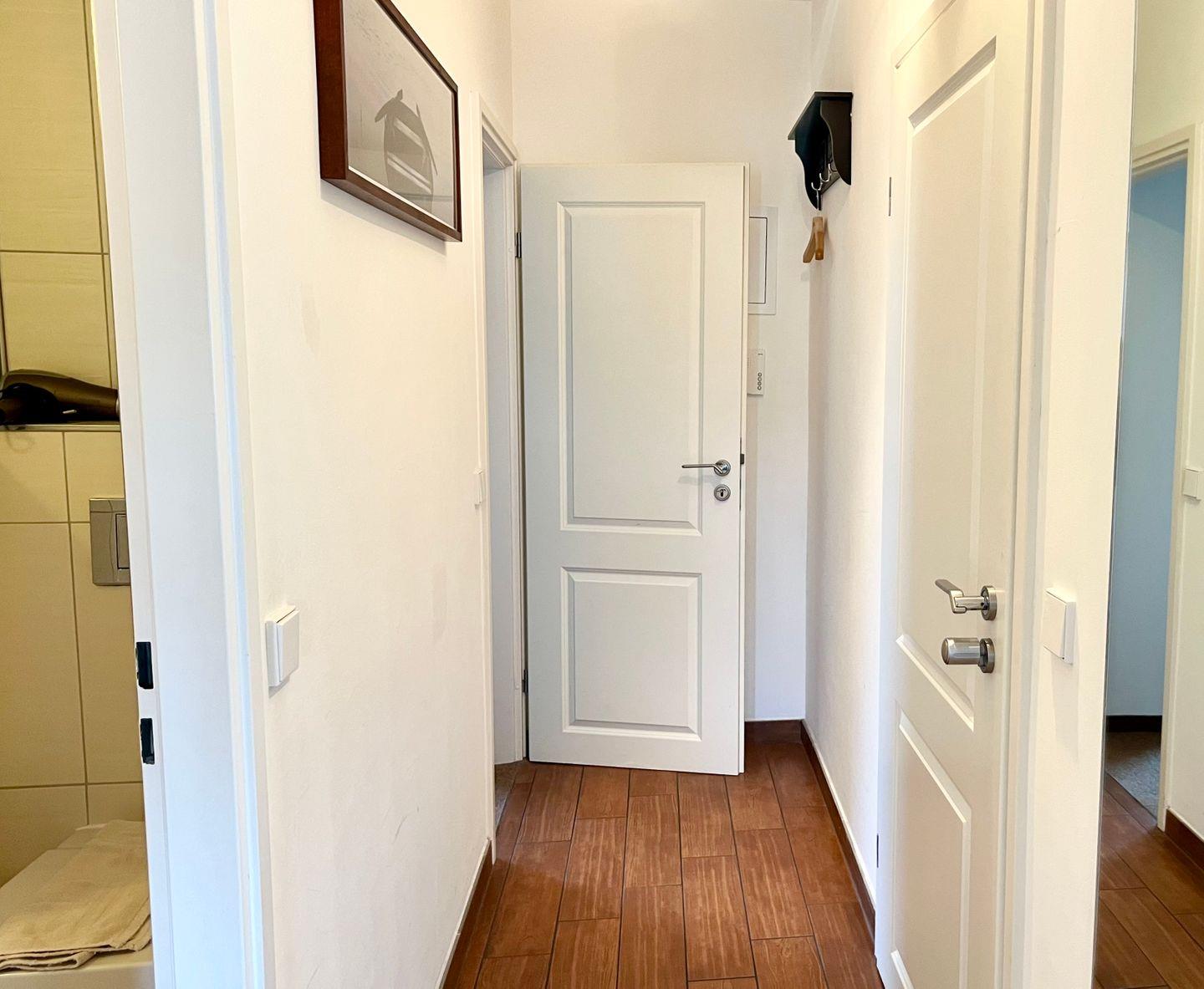 Diese gemütliche 3-Zimmer-Wohnung im 2. Stock bietet auf 55 qm eine komfortable Ausstattung für bis zu vier Personen. Der Wohnbereich verfügt über eine gemütliche Sitzecke und eine offene Küchenzeile mit Tresen, die zum gemeinsamen Kochen und Verweilen einlädt. Die Küche ist unter anderem mit einer Kaffeemaschine ausgestattet. Das Hauptschlafzimmer ist mit einem Doppelbett ausgestattet, während das zweite Schlafzimmer über ein Etagenbett verfügt – ideal für Kinder oder weitere Gäste. Ein möblierter Balkon lädt zum Entspannen an der frischen Luft ein.