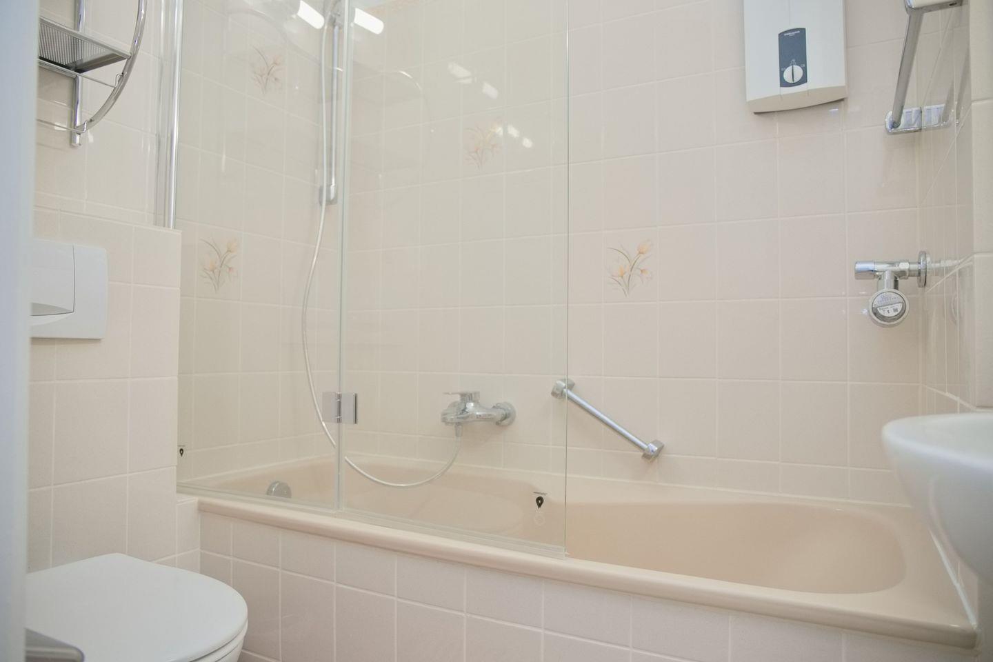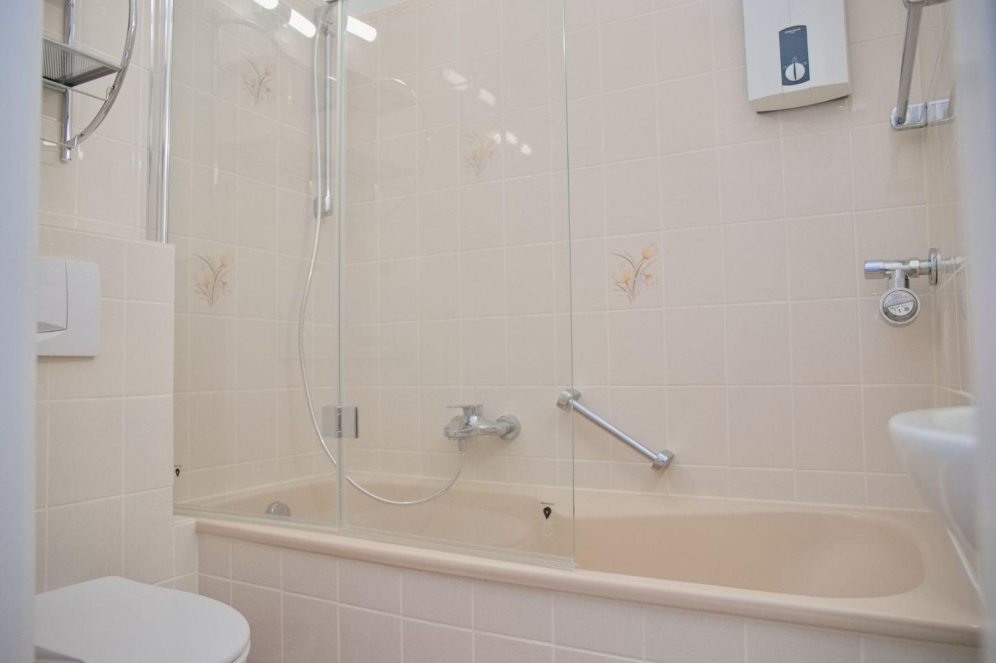 Das Badezimmer ist mit einer Badewanne samt Duschvorrichtung, Waschbecken, Spiegel und WC ausgestattet. Alles da für einen entspannten Start in den Tag.