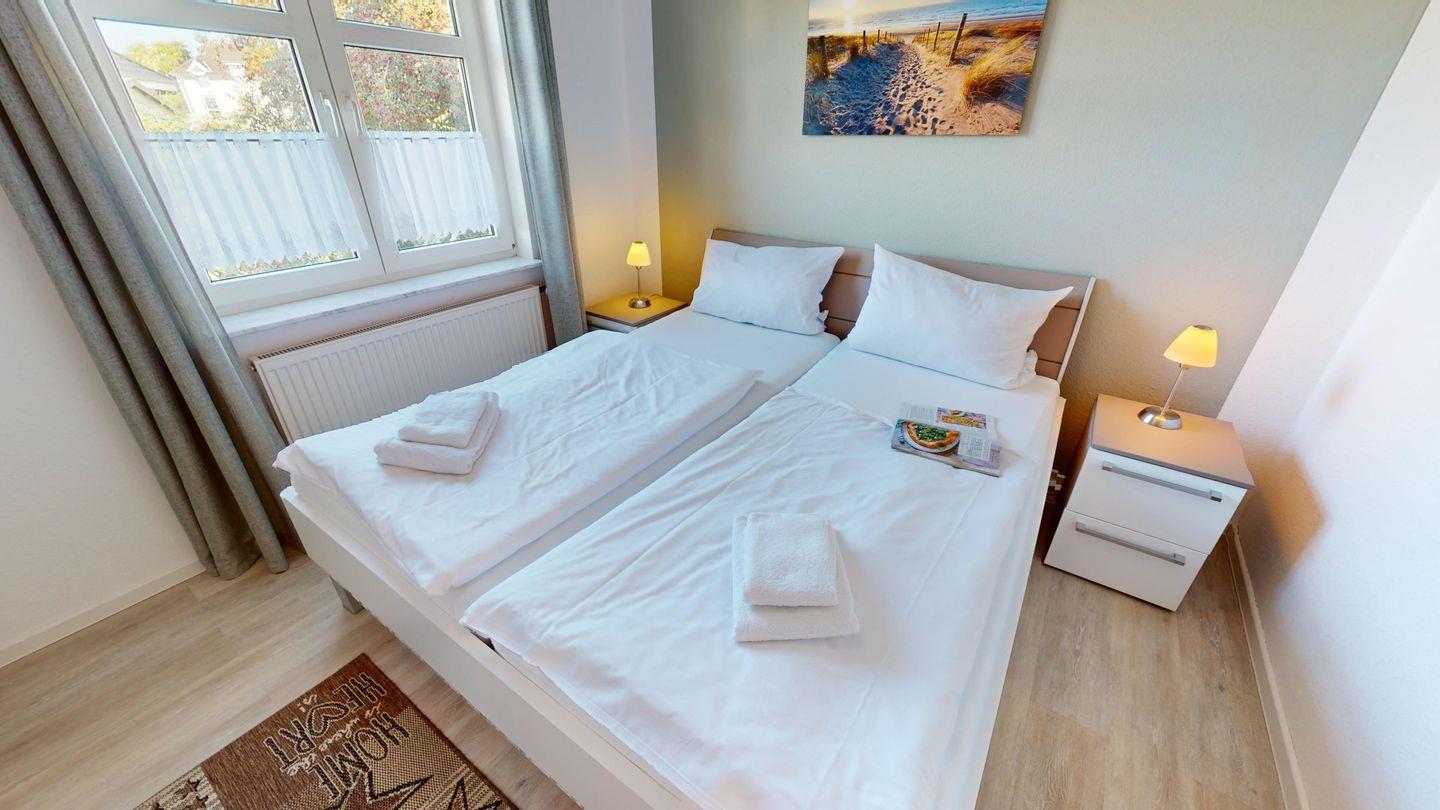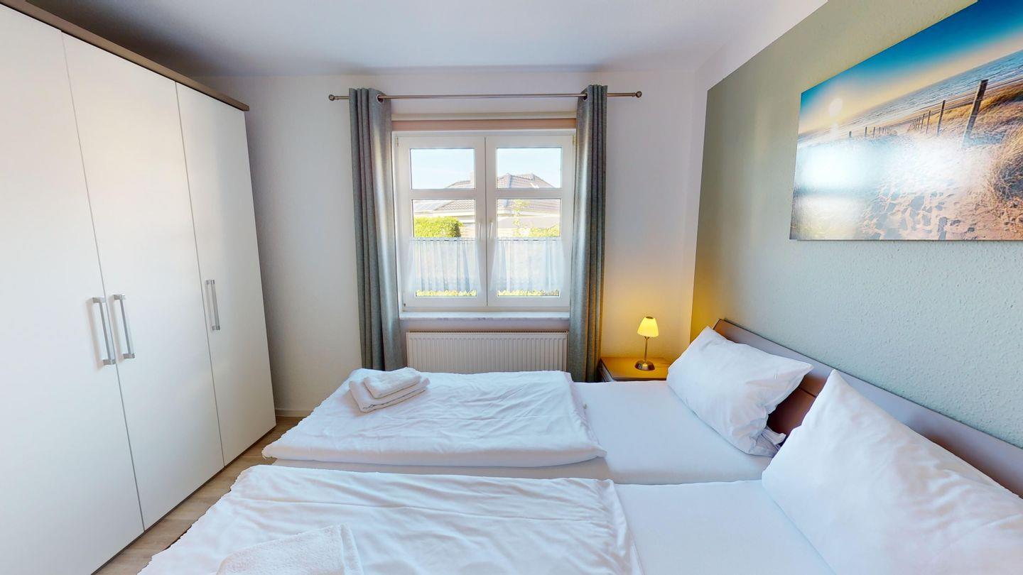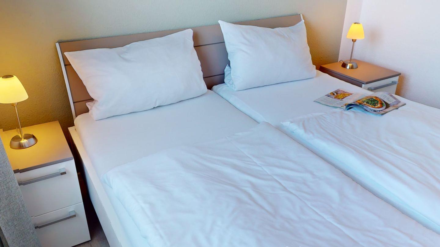 Insgesamt stehen Ihnen zwei Schlafzimmer - eins mit Doppelbett und eins mit zwei Einzelbetten - für die nächtliche Ruhe zur Verfügung. Die Couch im Wohnzimmer kann zusätzlich als Schlafcouch für zwei Personen genutzt werden.
