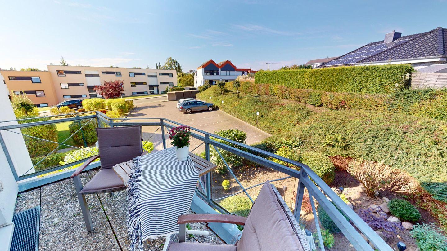 Das geräumige Wohnzimmer grenzt an die offene, gut ausgestattete Küche mit einem Essbereich, der einen Blick auf den möblierten Balkon bietet.