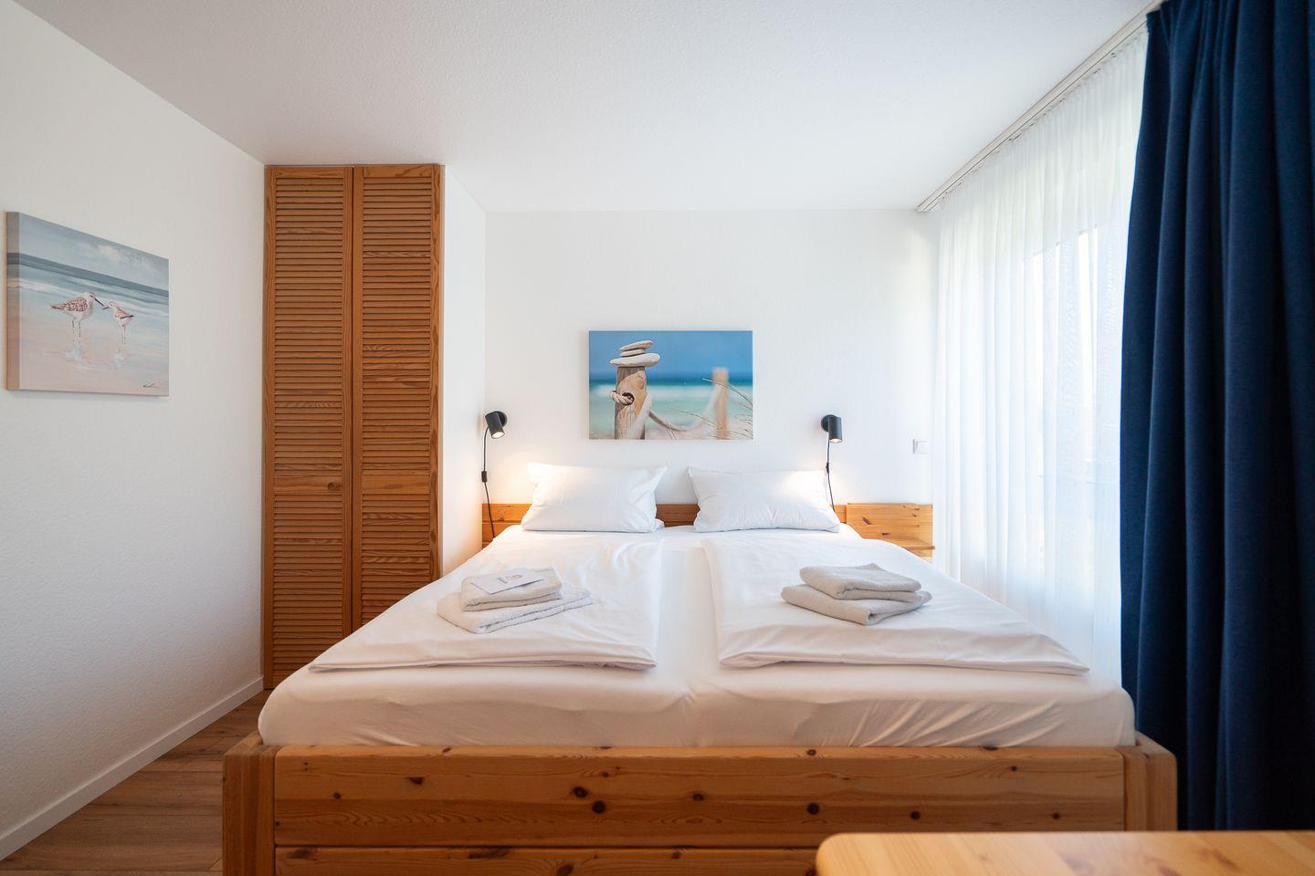 Mit einem hellen Wohn-/ Essbereich, einer separaten Küche, zwei Bädern mit Dusche und einem möblierten Balkon mit Meerblick ist alles für einen angenehmen Aufenthalt vorhanden. Eines der insgesamt drei Schlafzimmer verfügt über ein Doppelbett, das Zweite über zwei Einzelbetten und das Dritte über ein Einzelbett.