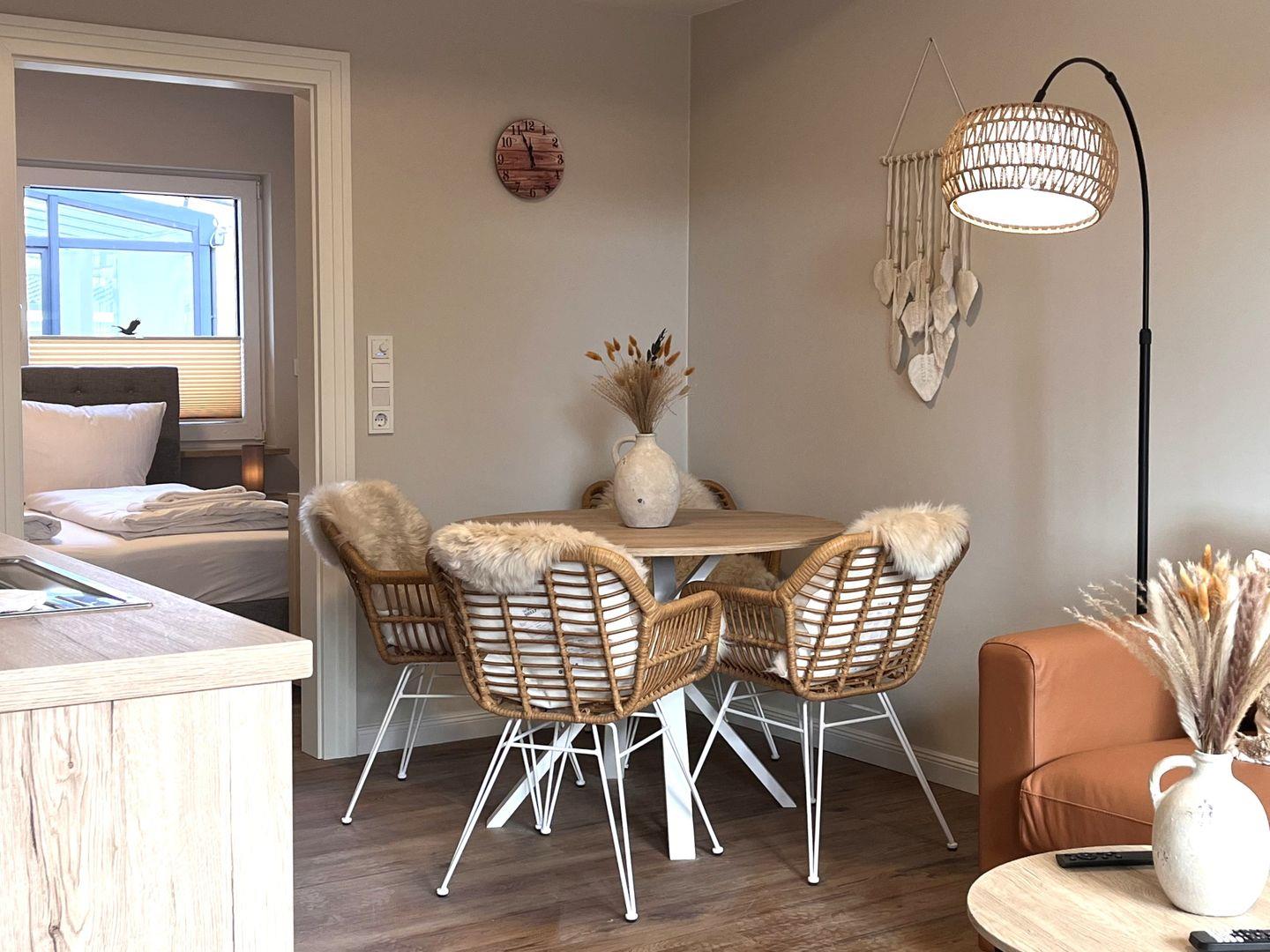 Die Wohnung wurde im Jahr 2025 erbaut und überzeugt durch ihre hochwertige, zeitgemäße Ausstattung im Boho-Stil. Mittelpunkt der Unterkunft ist der helle Wohn- und Essbereich mit einer offenen Küche, die zum gemütlichen Zusammensein einlädt. Hier finden Sie eine komfortable Sofalandschaft sowie einen Esstisch, an dem sich gemeinsame Mahlzeiten genießen lassen. Der Küchenbereich ist umfassend für Selbstversorger ausgestattet: Zur Verfügung stehen eine Kaffeemaschine, ein Wasserkocher, ein Toaster, ein Kühlschrank mit Gefrierfach, ausreichend Küchenutensilien sowie ein Herd mit zwei Kochplatten. Außerdem ist Geschirr und Besteck für einen entspannten Aufenthalt vorhanden.