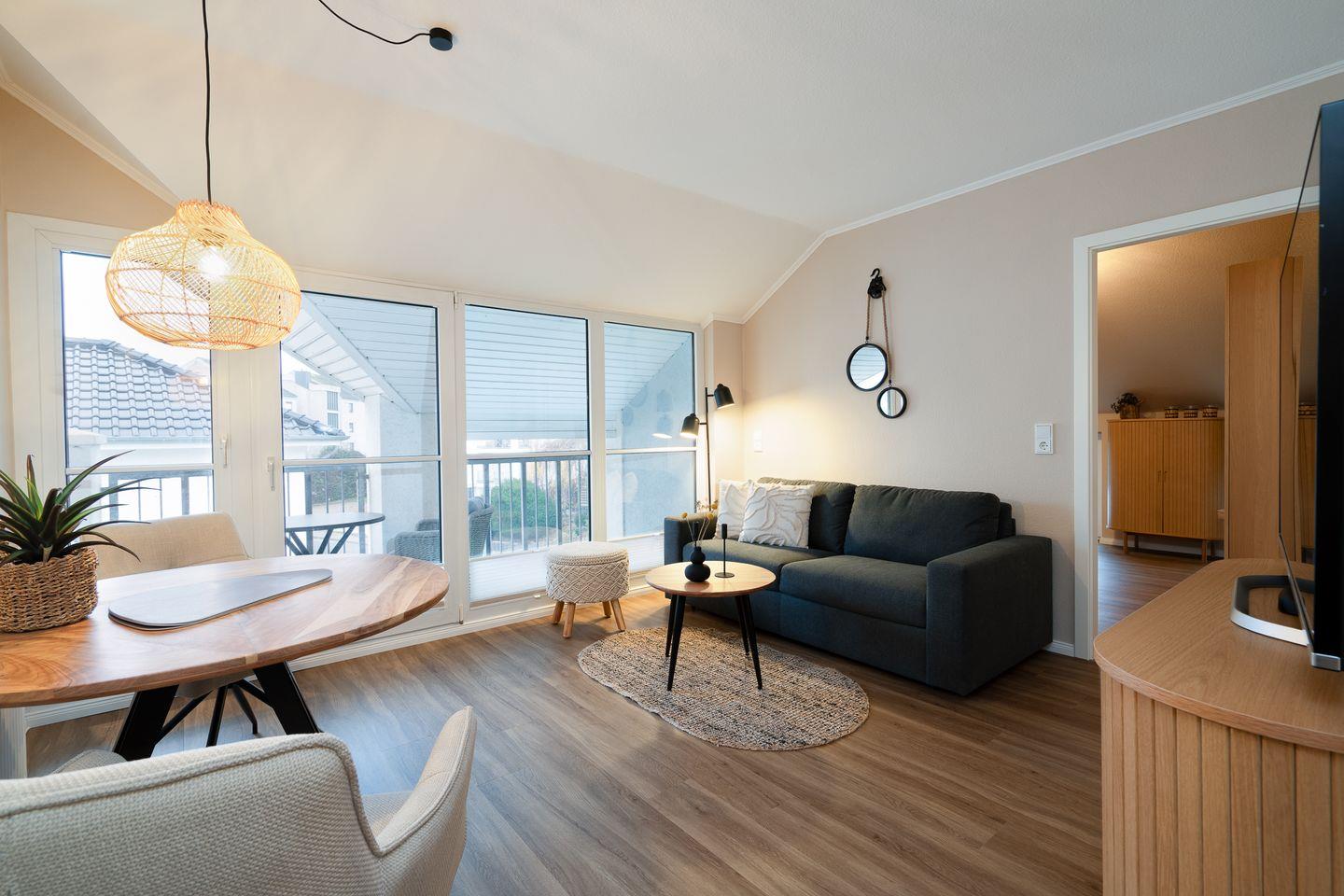 Der anschließende offene Wohn-Essbereich lädt zum Entspannen ein: Ein gemütlicher Esstisch und eine komfortable Sofa-TV-Ecke schaffen den idealen Ort für entspannte Abende. Von hier erreichen Sie auch den Balkon, auf dem Sie frische Luft und sonnige Momente genießen können.