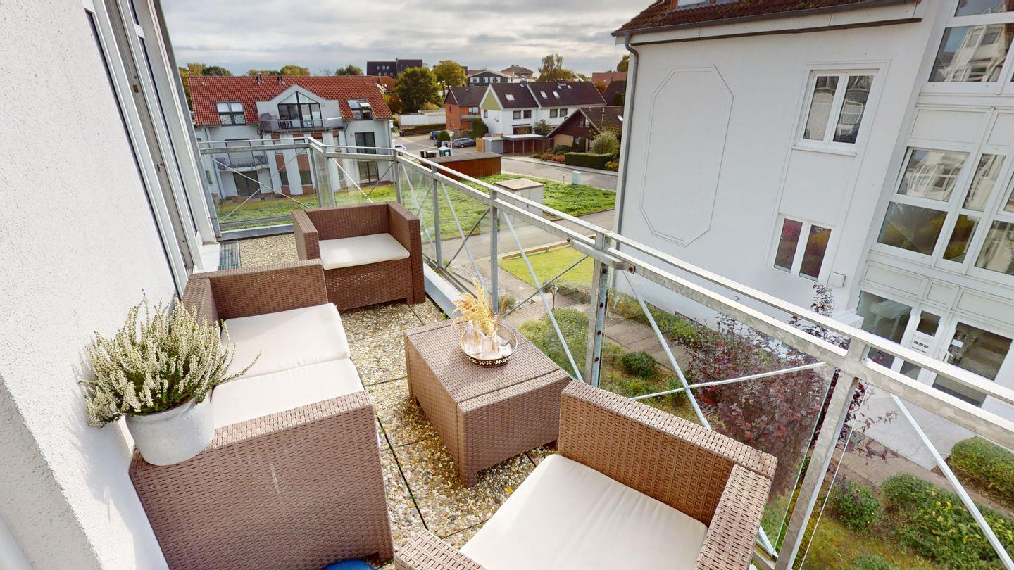 Im Anschluss an den Wohn-/Essbereich mit offener, schicker Küche liegt der möblierte Balkon mit Strandkorb, wo Sie entspannte Stunden verbringen können.