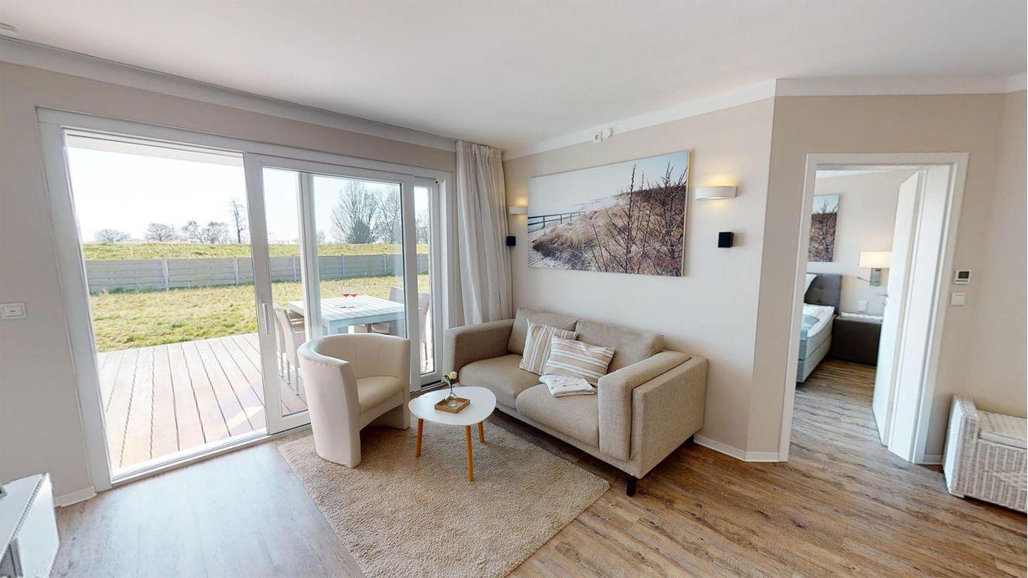 Im Wohnzimmer lädt ein gemütlicher Sofabereich mit Kaminofen und ein großer Flachbildfernseher zum Entspannen ein. Das kuschelige Schlafzimmer verfügt über ein hochwertiges Boxspringbett und ein Flachbild-Fernseher, während das Badezimmer mit einer großen, bodengleichen Dusche mit Regenbrause, einer Whirlwanne, einem beleuchteten Wand- und Kosmetikspiegel und einem Fön ausgestattet ist. Die große Terrasse mit Terrassenmöbeln und modernem Gas-Grill (Gasflaschen werden bereitgestellt) ist sowohl vom Wohnzimmer als auch vom Schlafzimmer aus erreichbar.