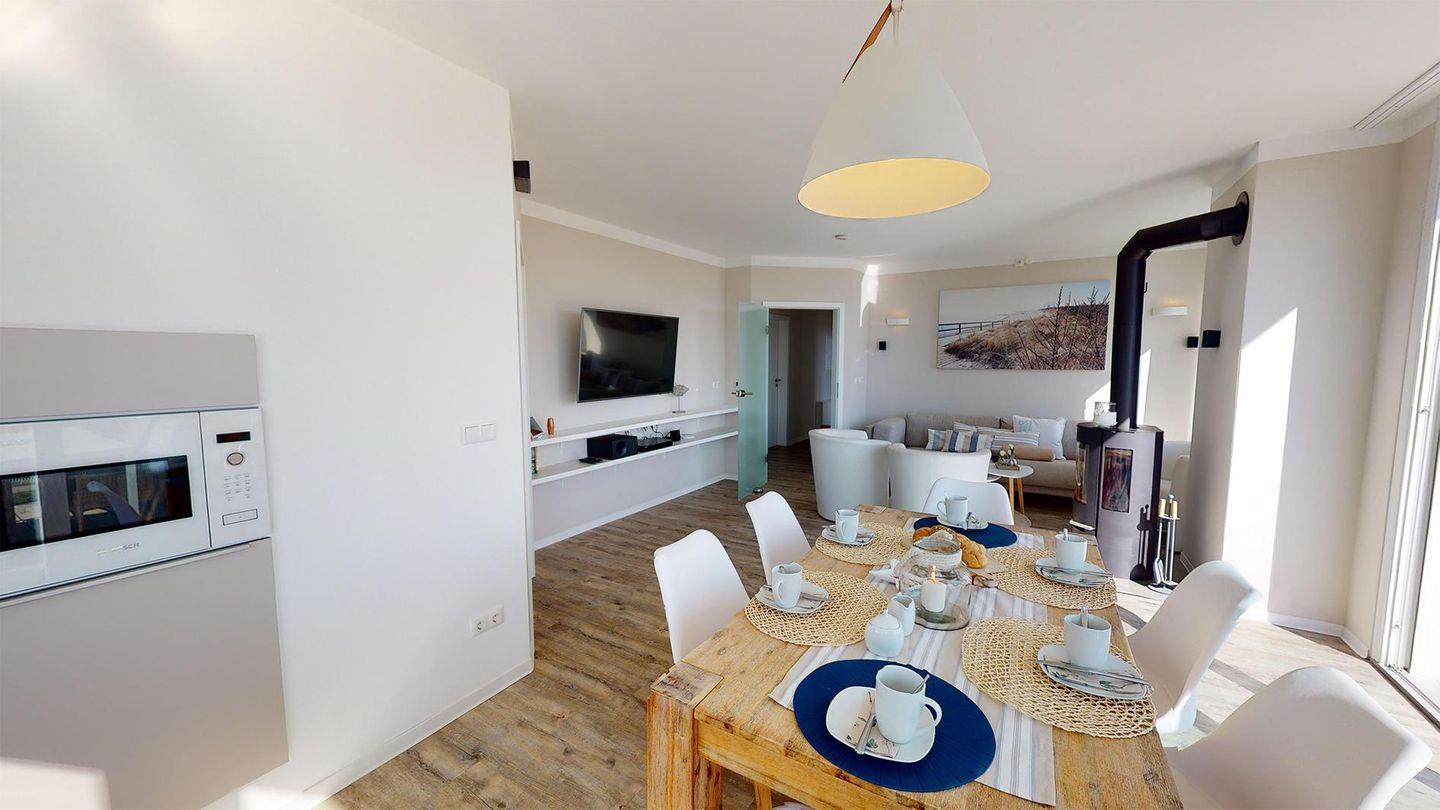 Das Wohnzimmer zeichnet sich durch seine Helligkeit aus, während die voll ausgestattete Küche zum Genießen einlädt. Ein Essbereich und ein gemütlicher Sofabereich mit Kaminofen vervollständigen den Wohnraum.