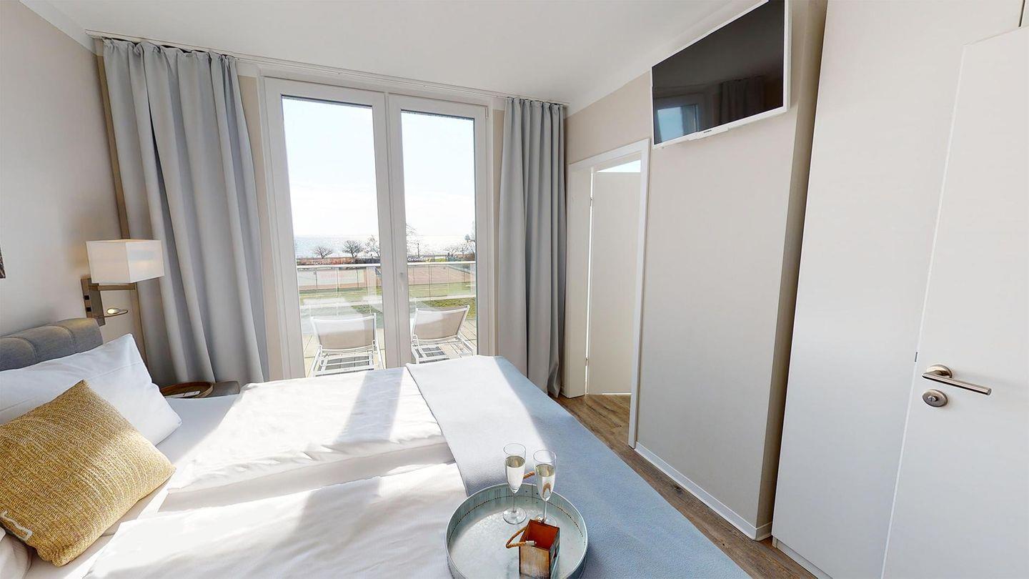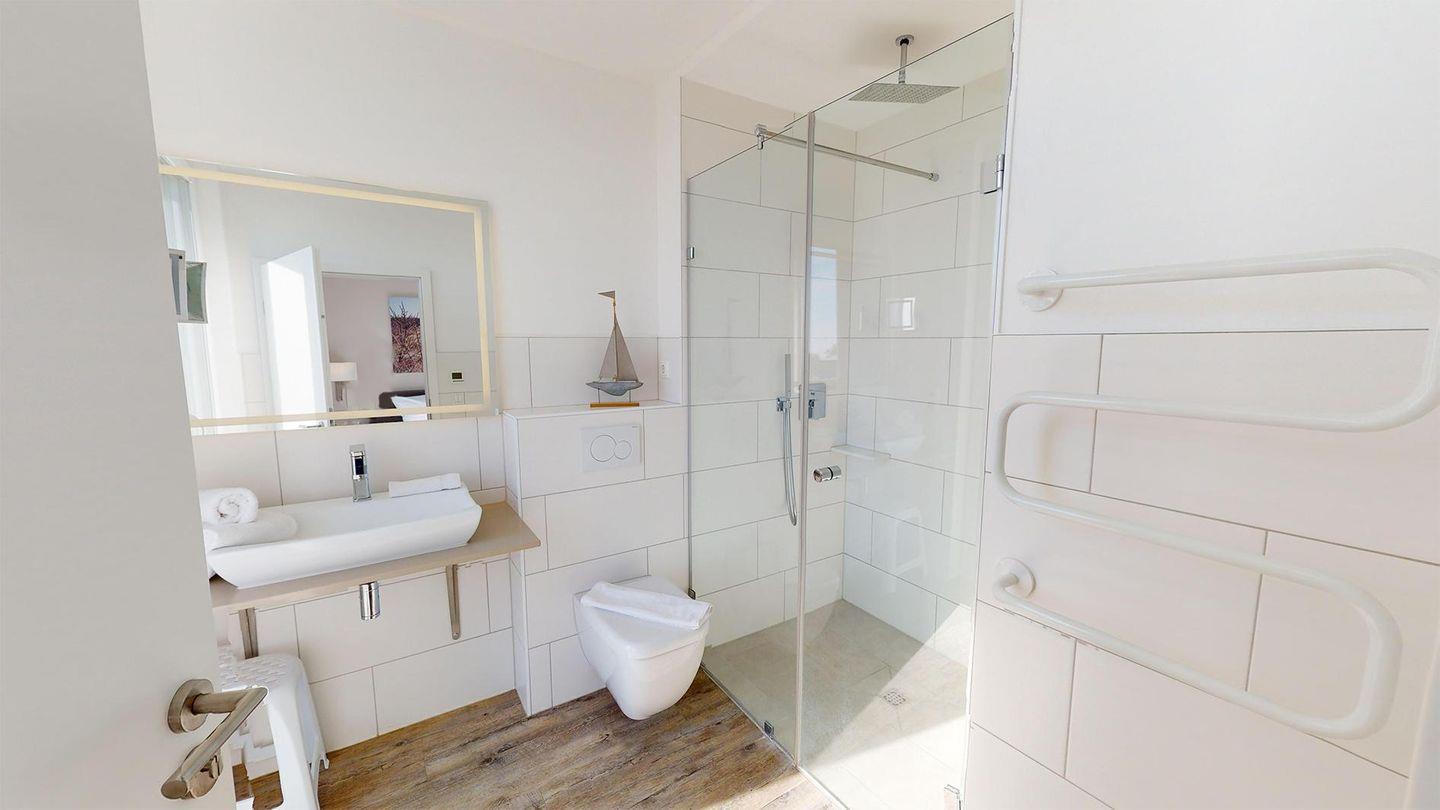 Die drei Schlafzimmer sind mit hochwertigen Boxspringbetten ausgestattet, inklusive Verdunklungsplissees und Flachbildfernsehern. Zwei Duschbäder mit Regenbrause sind über die jeweiligen Schlafzimmer erreichbar, während das dritte Duschbad mit Regenbrause und Whirlwanne über den Flur zugänglich ist. Alle drei Bäder sind mit beleuchteten Wand- und Kosmetikspiegeln sowie Wandradios mit Bluetooth-Verbindung ausgestattet.